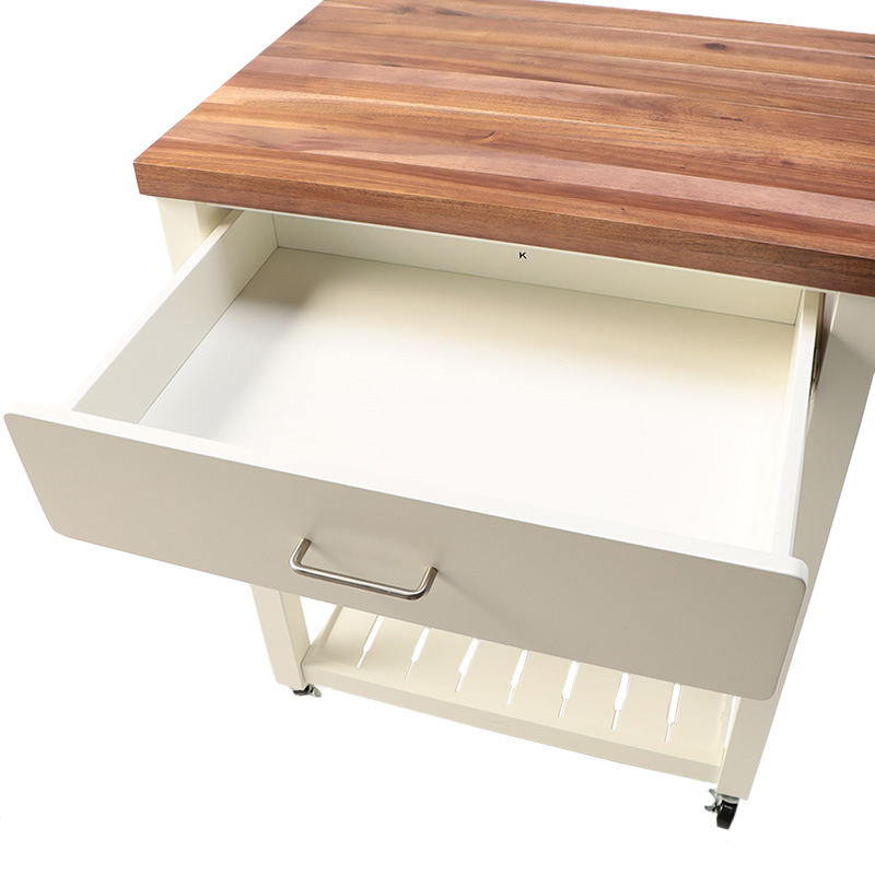 補助テーブルとしてもお使いいただけるワイドサイズです。引き出しにはカトラリーやユーテンシルなどを収納、棚には食材や食器などを収納することができます。