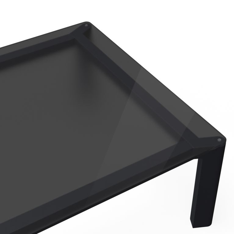 テーブルトップはブラックの強化ガラス、フレームは軽量でリサイクル率30%のアルミ素材から作られており、耐久性のある粉体塗装と滑らかで安全な丸みを帯びたエッジのデザインを特長としています。