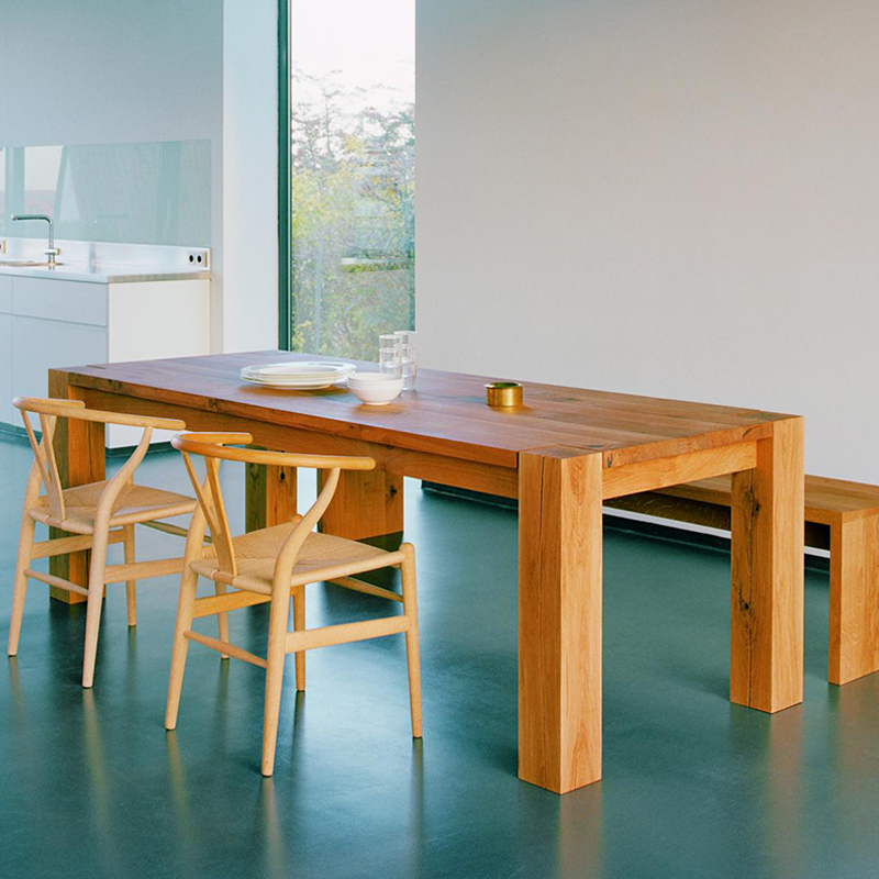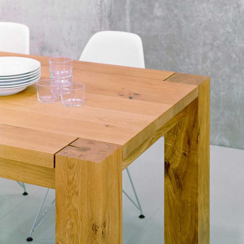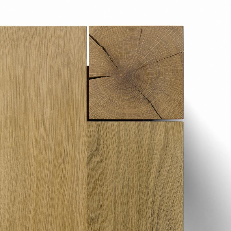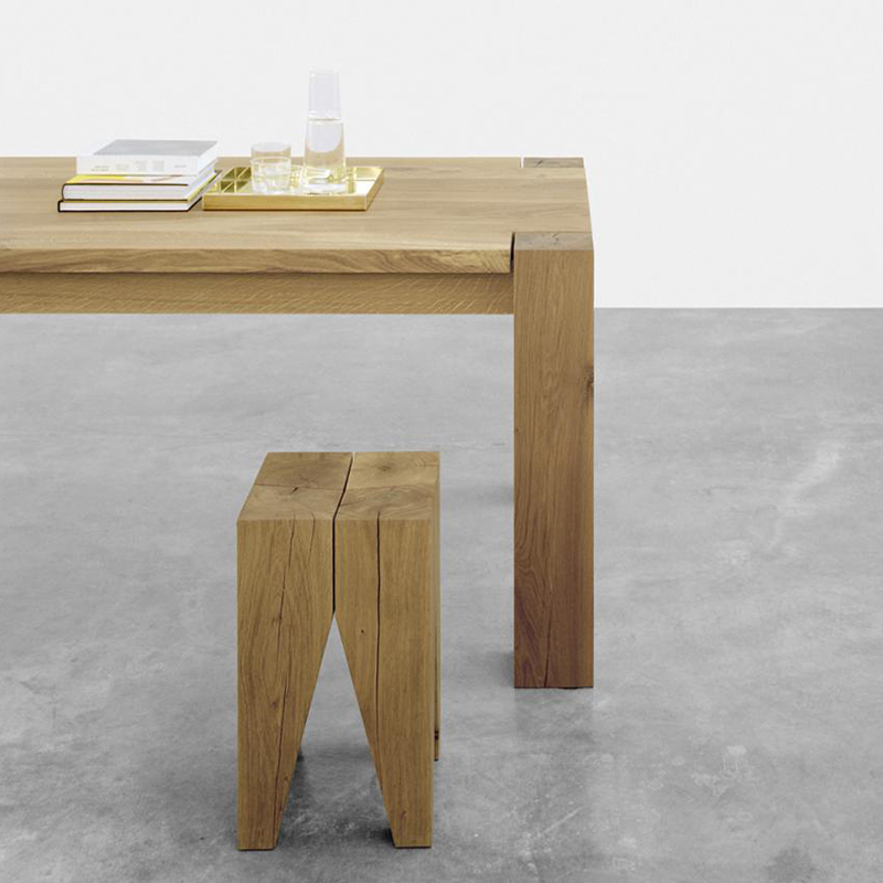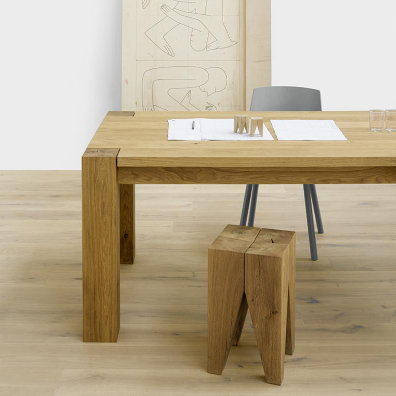 重厚感のある脚部と特徴的なコーナーディテールには、無垢材の中心部分を使用。無垢材の自然な乾燥過程で生まれるひび割れが、ひとつとして同じもののない個性を各テーブルに与えています。