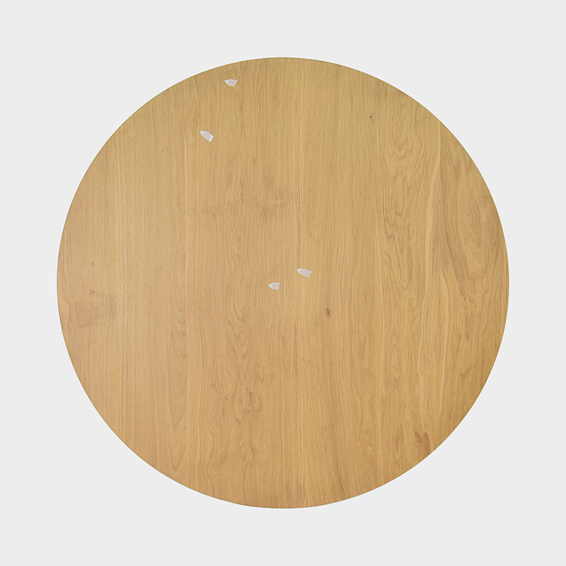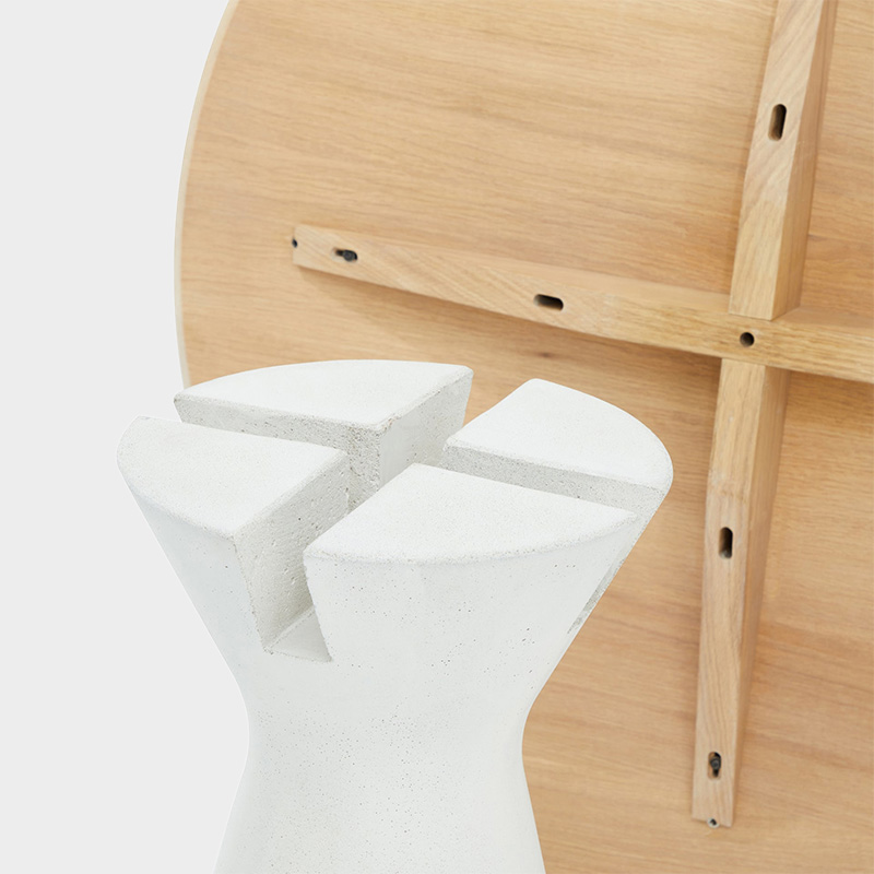 英国製のサステナブルな水性樹脂「ジェスモナイトストーン」と、無垢のヨーロピアンオークやアメリカンウォルナットのテーブルトップを使用し、ポルトガル製の精緻な建築技術で作られたクロスブレースで構成されています。卓越したデザインは、最高級の職人技と互いの情熱を反映したもので、どんな空間にも調和する美しい佇まいを持っています。