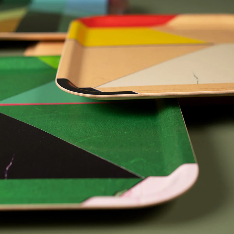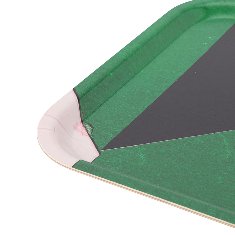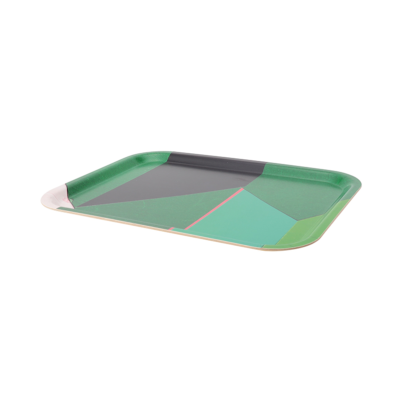 このトレイはグリーンとブラックのカラーバリエーションで、幾何学模様のプリントが施されています。