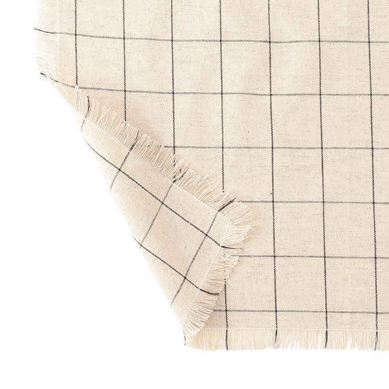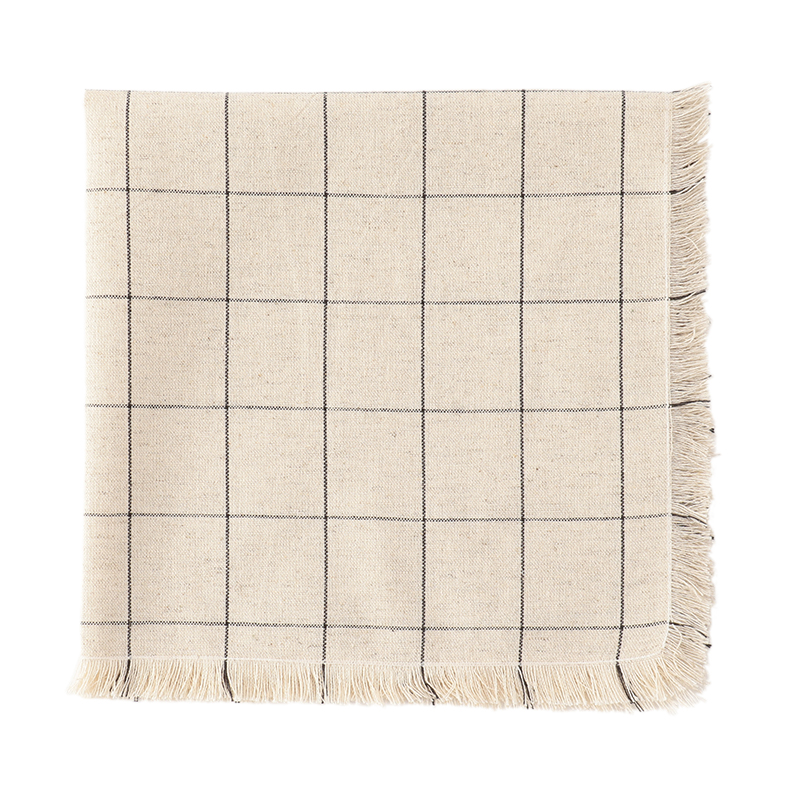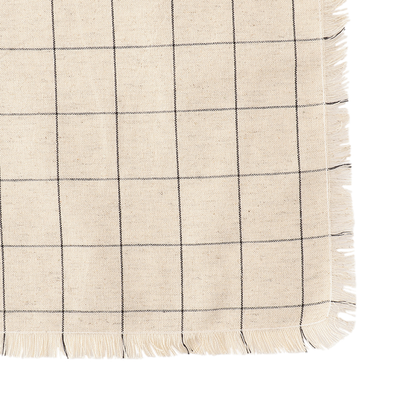 モノクロのチェック柄は、手作りならではの温かみと自然な色合いを感じさせ、フリンジの縁がシンプルなデザインにモダンなアクセントを加えています。