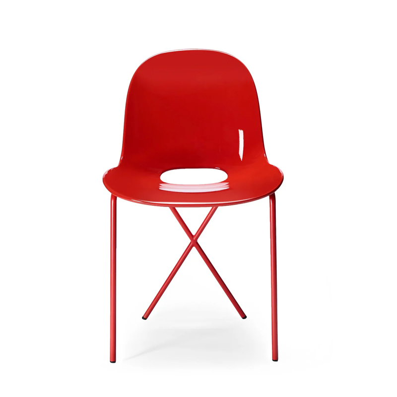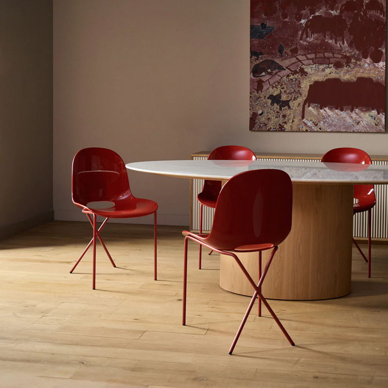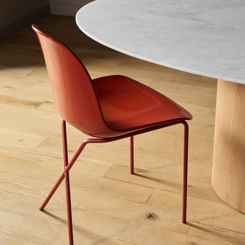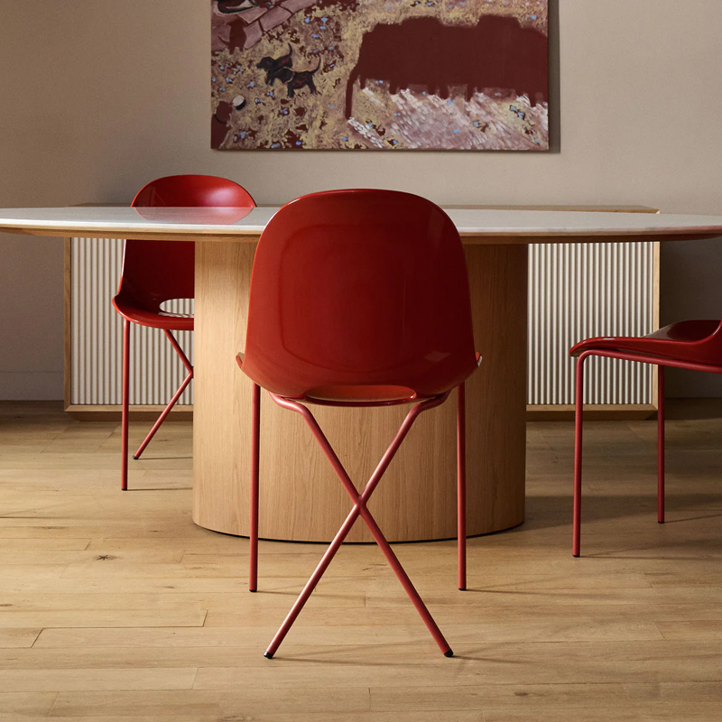 後ろ脚が交差するように配置されたフレームも、この椅子の印象的なデザインであり、名前の由来にもなっています。空間にアクセントを加える存在感のあるチェアです。The Conran Shop(ザ・コンランショップ)オリジナルデザインのCross Leg Gloss(クロスレッグ グロス)チェアは、艶のあるシェルと、マットなスチール脚を組み合わせた、美しいツートーンデザインが魅力のチェアです。