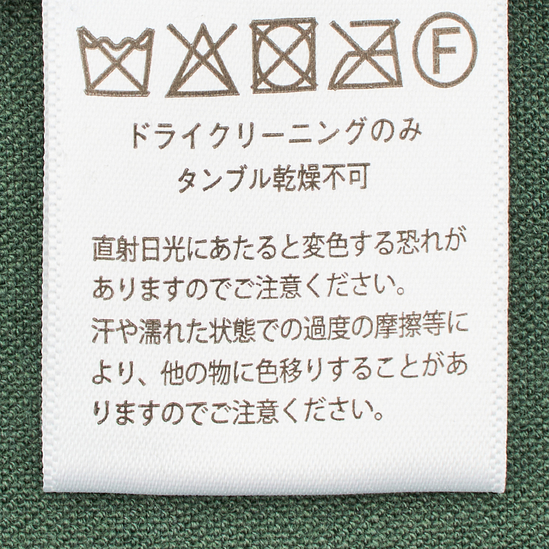 ドライクリーニングのみ、直射日光は変色の恐れがあるためお避け下さい。
