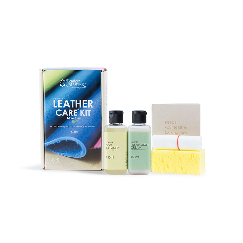 レザーマスター レザーケアキットTriple Freeは、革の汚れを泡で浮かせて取るクリーナーと、革の風合いをそのままに汚れを防ぎ革に必要な栄養と水分を浸透させるクリームがセットになっています。クリーナーは除菌効果もあり、クリームはフッ素を使用せず環境負荷の低い物質を用いて撥水効果を発揮します。