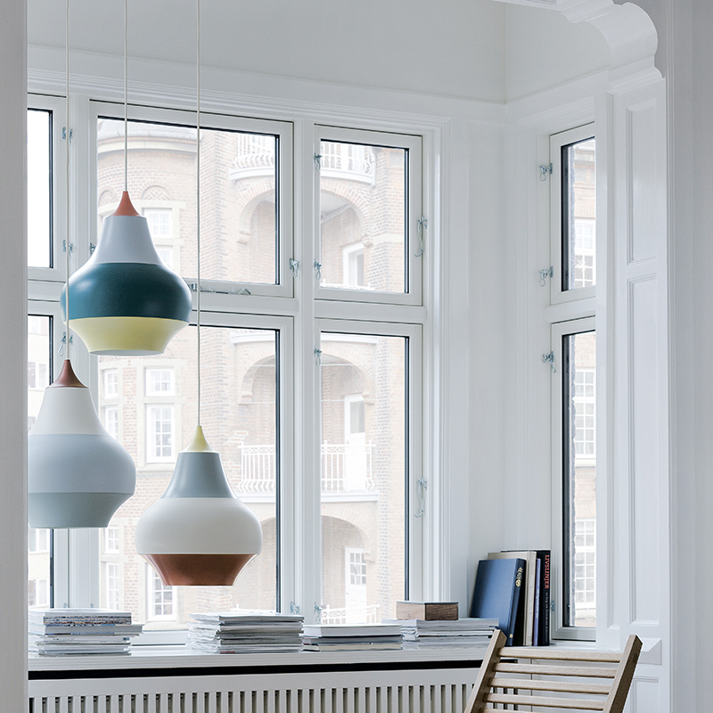 「スィルク」 と名づけられたこの製品のデザイン・インスピレーションとなったのは、なんと観覧車や綿菓子、コマ、遊園地。点灯時もスイッチを消した時も、トラディショナルな照明とは少し違った色と形で、周囲にエッジとカリスマ性を与えます。また、「スィルク」はレストランやバー、そしてキッチンにもダイニングルームにも最適。光源の直接光とシェード内部の反射光が合わさって下向きに広がり、通常の高さではグレアのまったくない、落ち着いた照明となります。強い直接光で下方を照らすので、テーブル上に低く、あるいは部屋のコーナーにまとめて低く吊り下げるのがおすすめです。シェードはアルミ製で、内側はマット仕上げのホワイト塗装。空間にきりっとした個性を加味する新しさを、是非体感していただきたいアイテムです。