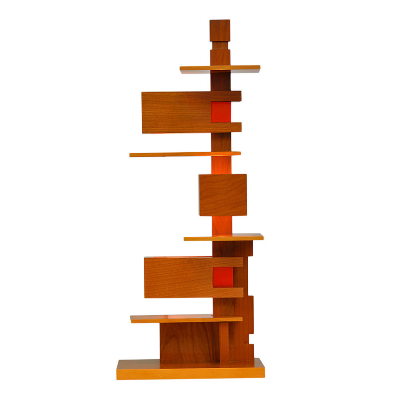 支柱にみられる四角い色のついた意匠には、ライトのお気に入りの色、チェロキーレッドが施されています。「四角い赤」は彼のマークでもあり、事務所の図面の承認印としても使われました。