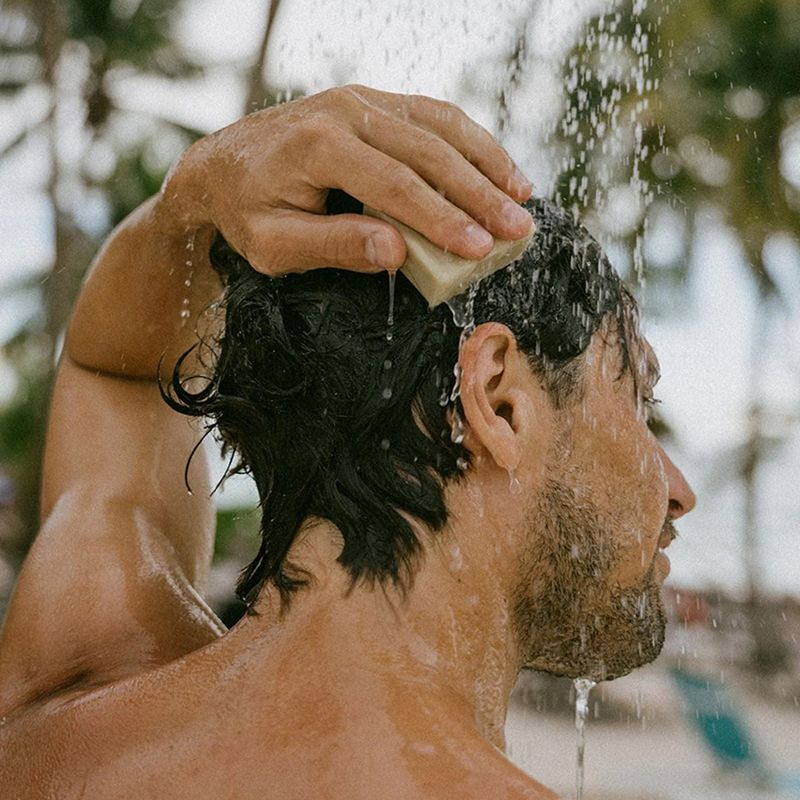 水の使用を最小限に抑えた、家族全員で使える固形タイプのシャンプーバー。50~75回程度ご使用いただけます。