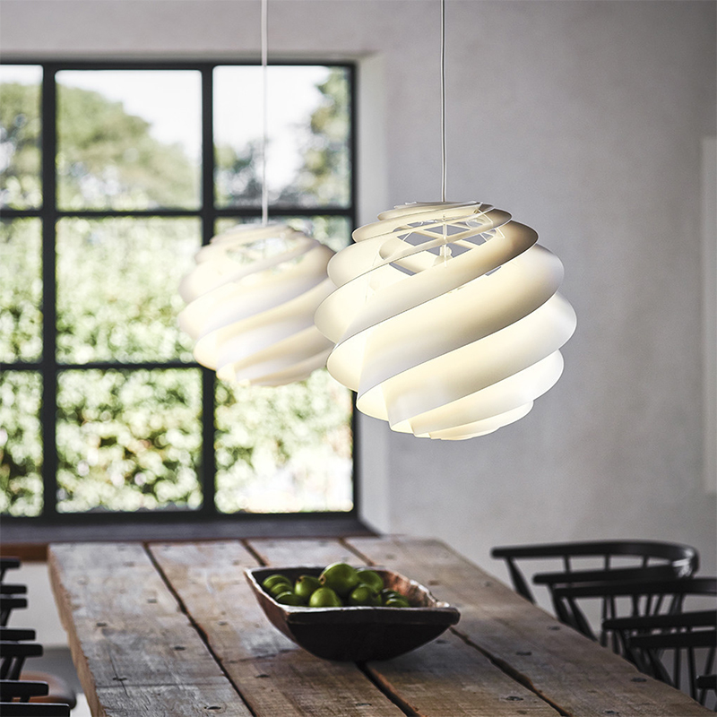 スワールはフィボナッチ数列からヒントを得てデザインされました。これは自然界にも存在する最も美しいとされる螺旋で、カタツムリの殻、ヒマワリの種、松ぼっくりのまつかさなどにも見られます。シェードから漏れる柔らかな光と影のコントラストが美しく、どこから見ても光源となる電球が見えないよう計算しつくされたあかりです。