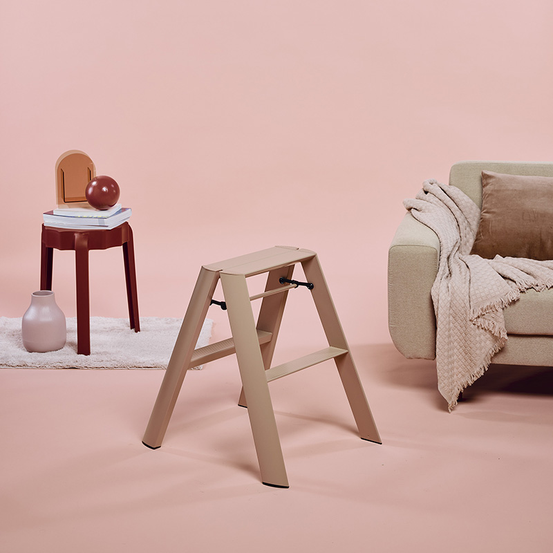 自立機能により、置き場所を選ばず、使いたい時にすぐに使える「隠さない脚立」ルカーノに新色が仲間入り。マットな風合いが空間に溶け込み、彩りを与えます。