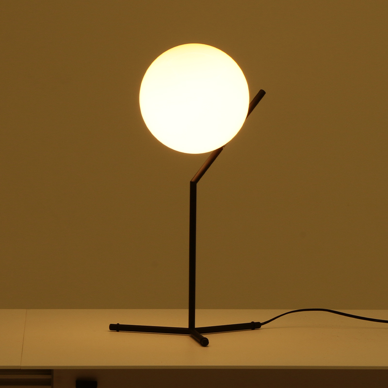 平衡感覚を保つように傾いた棒の上を絶妙なバランスで姿を見せ、ぼんやり浮かび上がるような乳白色のランプのデザインは、幻想的な雰囲気を醸し出しています。