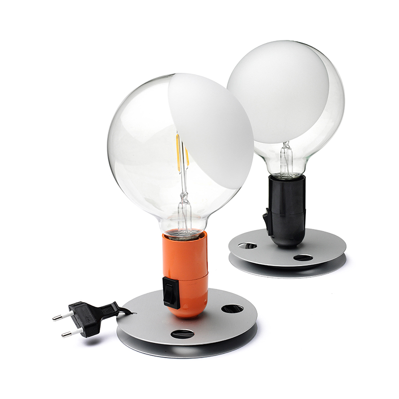 アルマイト加工されたアルミベースは、余分にのびた電源コードをすっきりと巻き付けることができます。透明のグローブランプの一部がサンドブラスト加工されているため、ライトの光がやわらかく拡散されます。