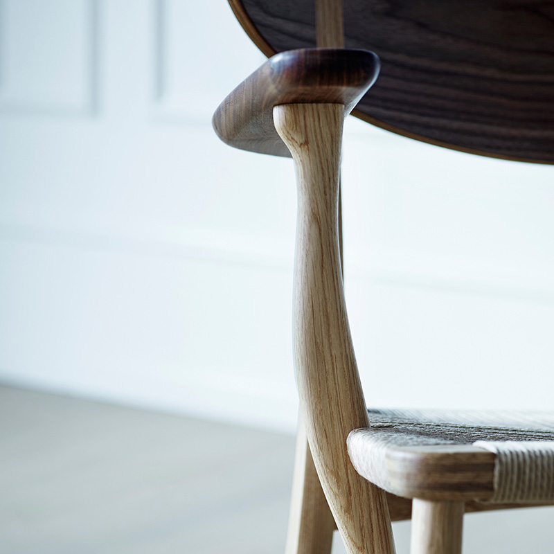アームレストの形状、ペーパーコードを施した座面、そして印象的な成形合板製の背もたれ。随所にウェグナーデザインならではの特徴が見られる椅子となっています。