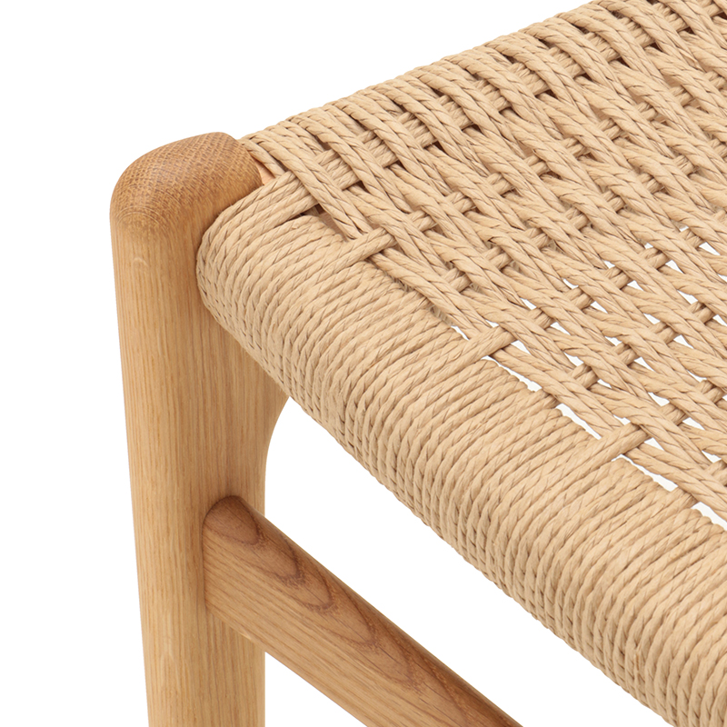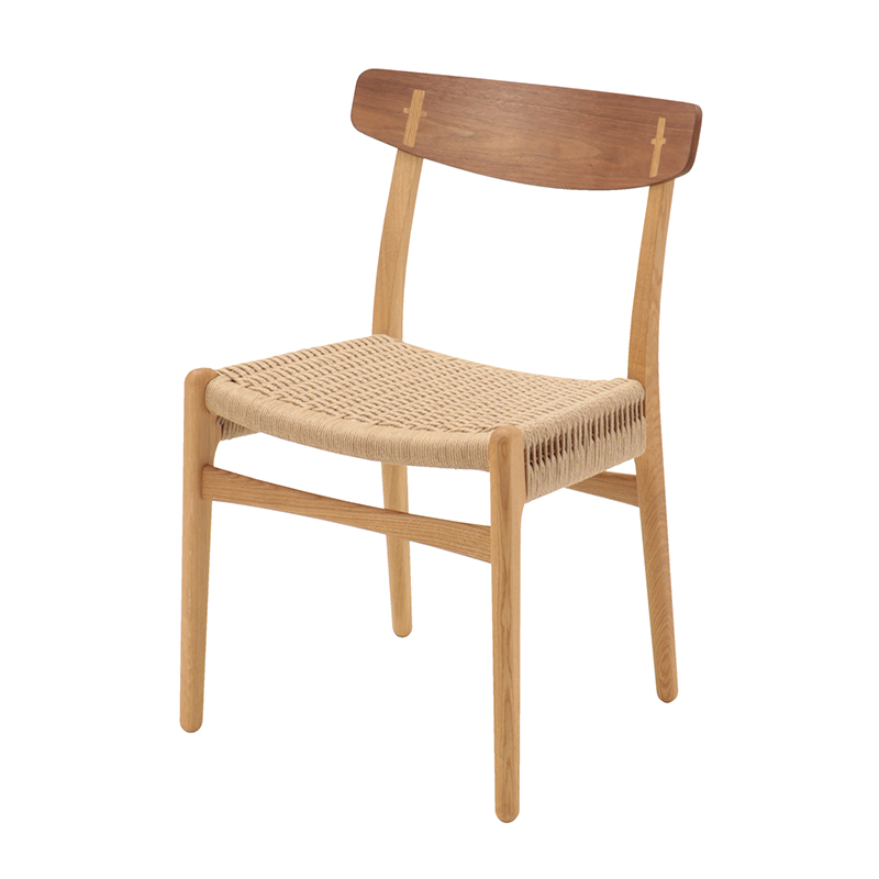 家具デザイン界の巨匠、ハンス J. ウェグナー。シンプルさと優美さを極め、斬新かつ考え抜かれたデザインで世界的に知れられています。初期の頃から木材の持つ資質と可能性に注目。独自のデザインを生み出してきました。その初期の名作といえるのが、シンプルでありながら、ディテールに凝ったダイニングチェアCH23です。ウェグナーのデザインの中でも最もウェグナーらしいと言える、アームレスダイニングチェアCH23。背に施された埋木の形状、美しくダブルで張られたペーパーコード、そしてこの椅子に安定性を与える弧を描く後ろ脚と、随所にウェグナーらしい独特の意匠が散りばめられています。一見すると何も変哲のないシンプルな椅子ですが、よくみるとディテールに凝っていることがわかります。例えば、クラフトマンシップが映える埋木が美しい、曲げ木技術を応用した背もたれ。ウェグナーは成形合板の使用により、フレームとのコントラストを強調しています。家具デザイン界の巨匠、ハンス J. ウェグナー。シンプルさと優美さを極め、斬新かつ考え抜かれたデザインで世界的に知れられています。初期の頃から木材の持つ資質と可能性に注目。独自のデザインを生み出してきました。その初期の名作といえるのが、シンプルでありながら、ディテールに凝ったダイニングチェアCH23です。ウェグナーのデザインの中でも最もウェグナーらしいと言える、アームレスダイニングチェアCH23。背に施された埋木の形状、美しくダブルで張られたペーパーコード、そしてこの椅子に安定性を与える弧を描く後ろ脚と、随所にウェグナーらしい独特の意匠が散りばめられています。一見すると何も変哲のないシンプルな椅子ですが、よくみるとディテールに凝っていることがわかります。例えば、クラフトマンシップが映える埋木が美しい、曲げ木技術を応用した背もたれ。ウェグナーは成形合板の使用により、フレームとのコントラストを強調しています。