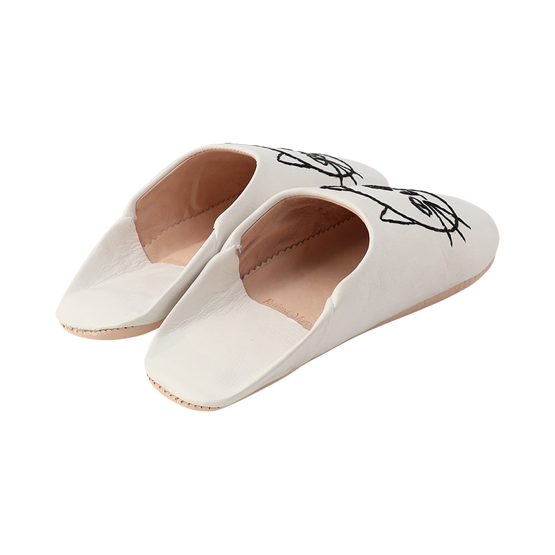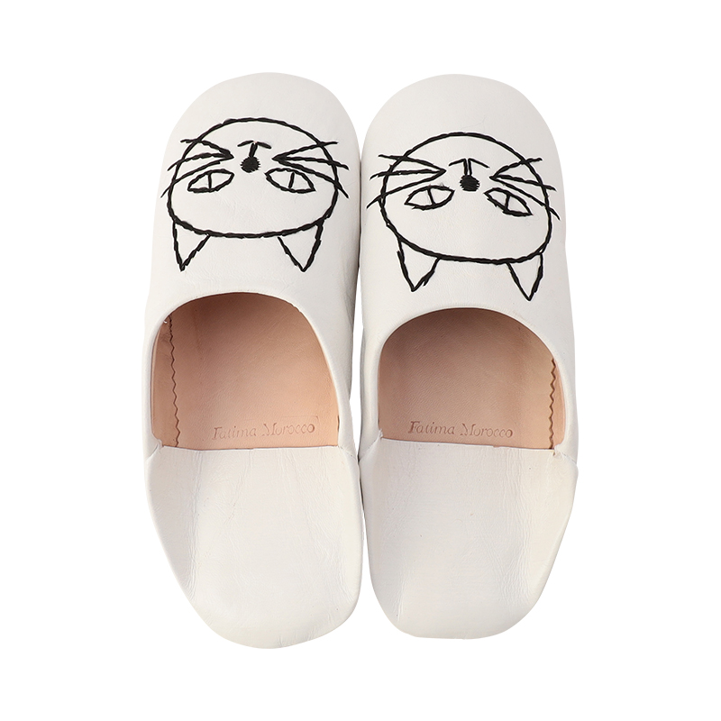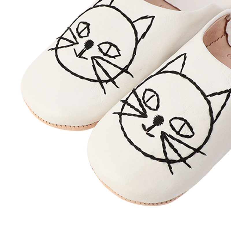 モロッコは、実は猫大国。旧市街を歩いているといたるところにいて、程よい距離感で共存生活を送っています。そんな猫をモチーフに、一針ずつ丁寧に刺繍を施したバブーシュです。