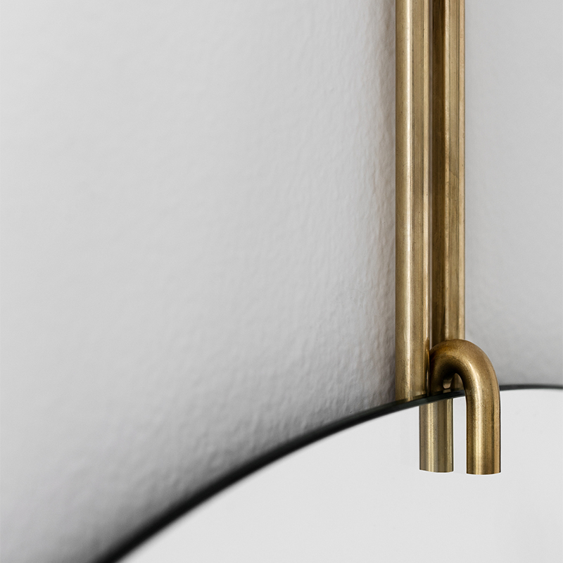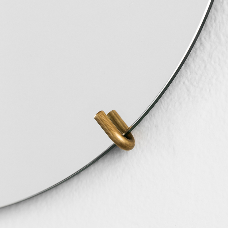鏡と金属製のフックのみで構成されたフレームレスのウォールミラー。