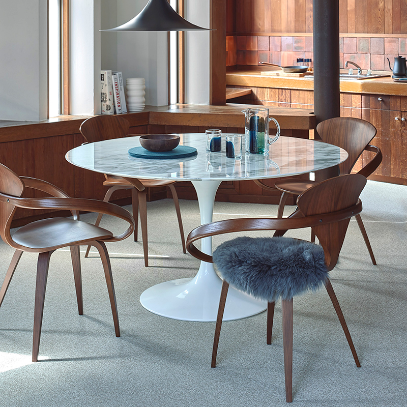 建築や家具のデザインを数多く手がけたデザイナー、Eero Saarinen(エーロ・サーリネン)によるデザインのSAARINEN TABLE(サーリネンテーブル)。1950年代のアメリカデザイン黄金期にTULIP CHAIR(チューリップチェア)と共に生まれたことから、別名チューリップテーブルとも呼ばれています。ミッドセンチュリーを代表する家具のひとつです。天板の大理石は、自然な柄を活かしながら日常使いに対応できるよう防汚コーティングが施されています。