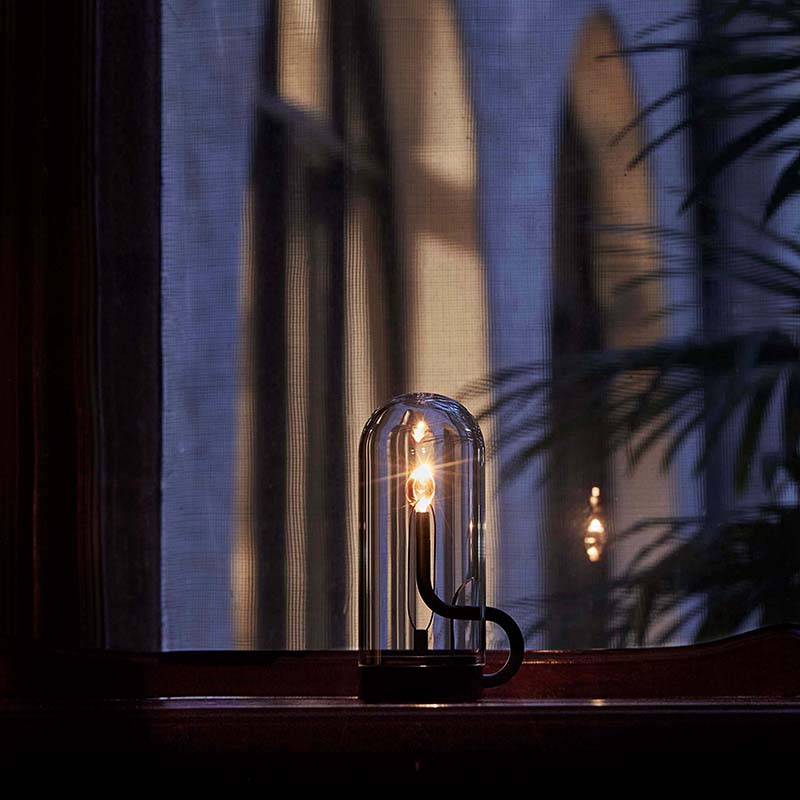 「火」という自然現象から受けた、デザイナー吉添氏自身の気づきや心の動きを、現代の光の在り方と重ね合わせながら、太古から人間の暮らしに寄り添う、持ち手付燭台に灯る炎のような照明器具へと落とし込んだデザインの「hymn(ヒム)」