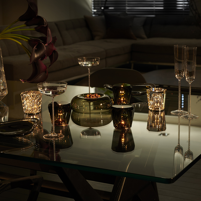 シェードはクリスタルガラスそのものが着色されているので、厚みによって色の濃淡の違いが生まれ、奥行きのある自然なグラデーションを楽しむことができます。定番のXtalシリーズと一緒に使うと風格が増し、習熟した大人のインテリアが完成します。