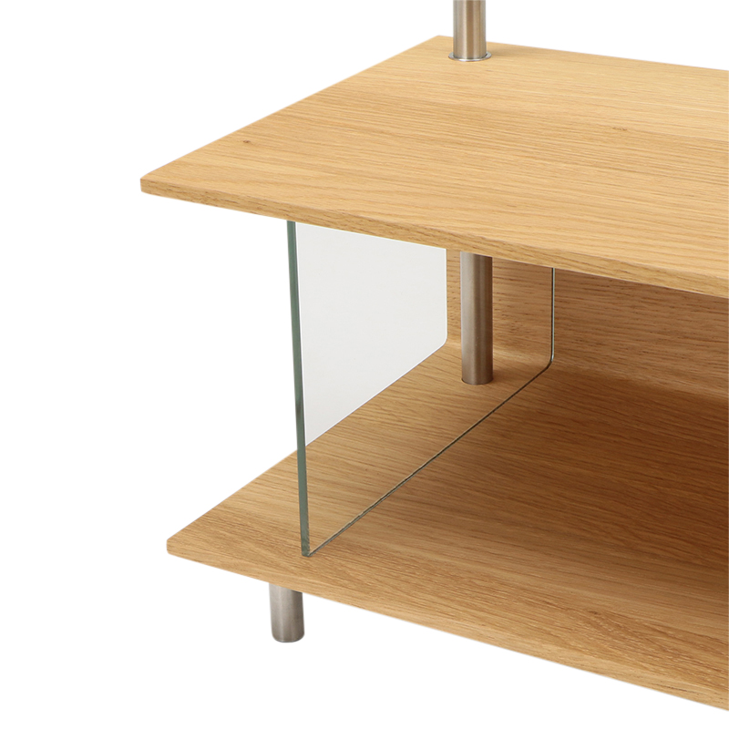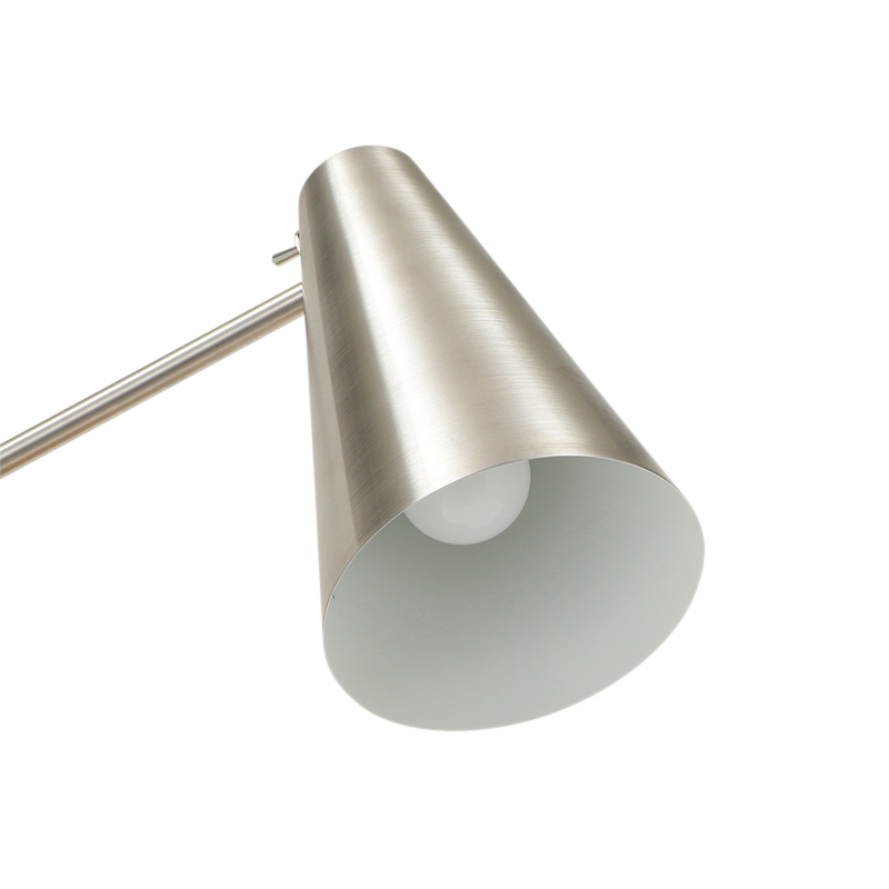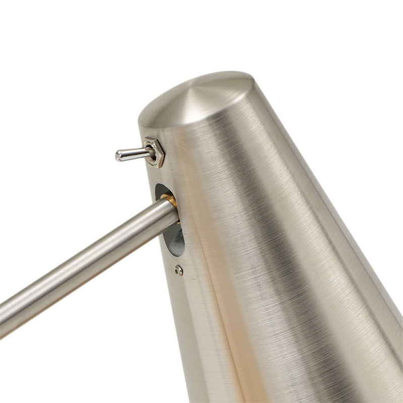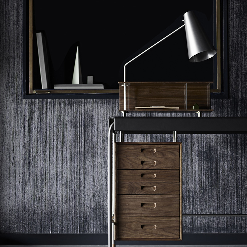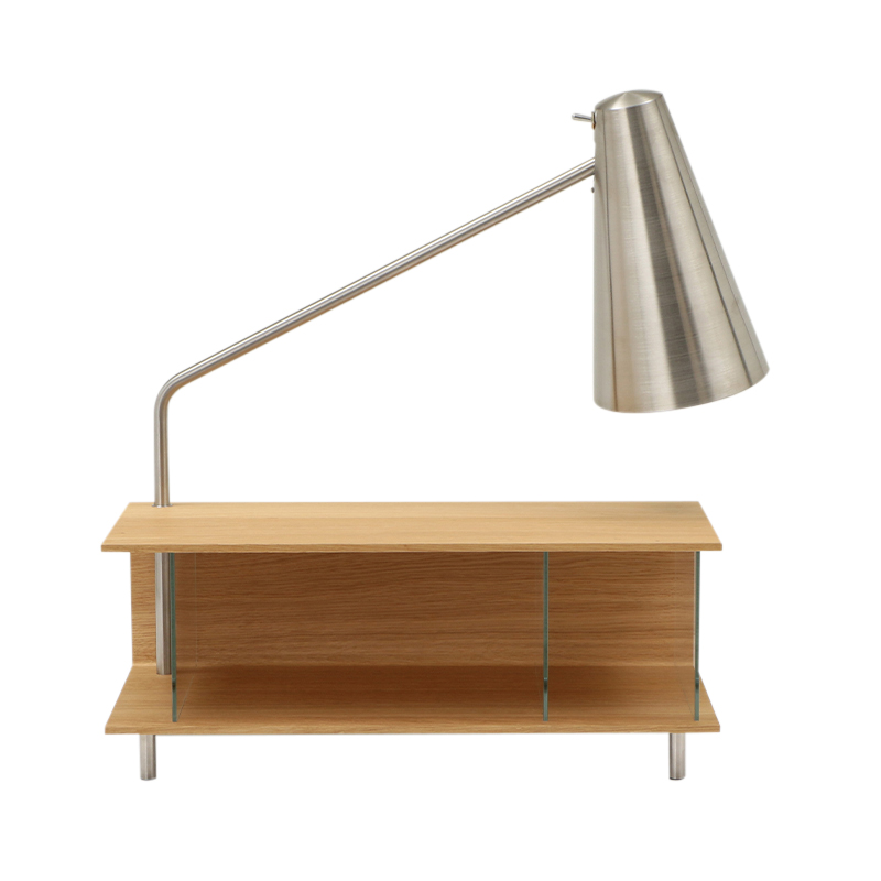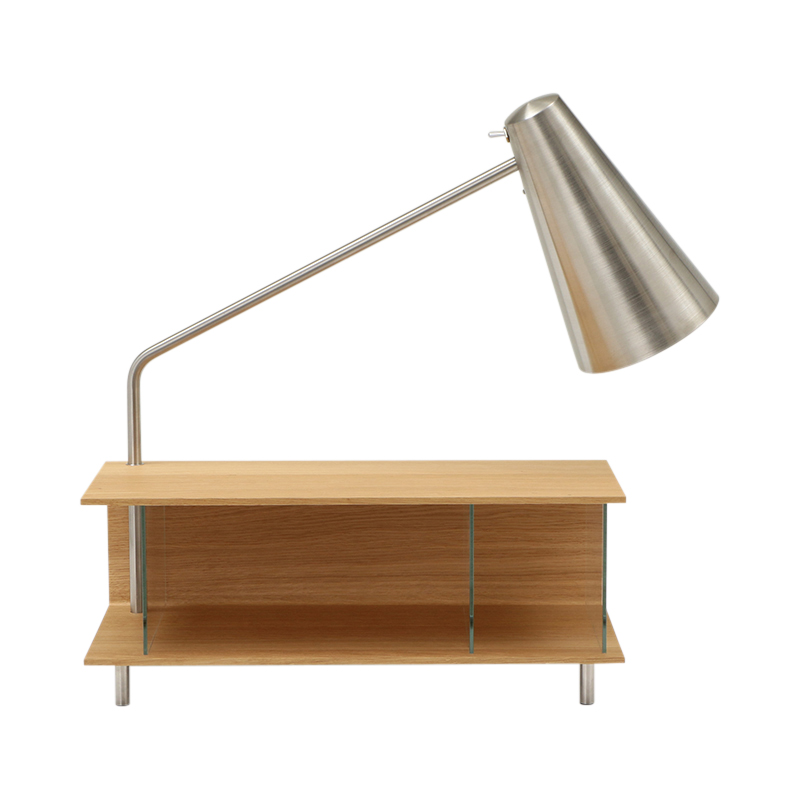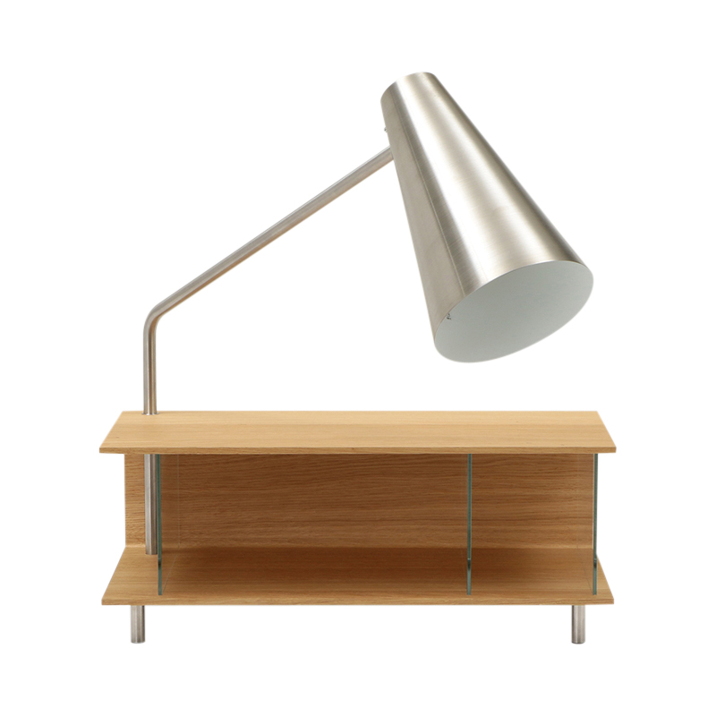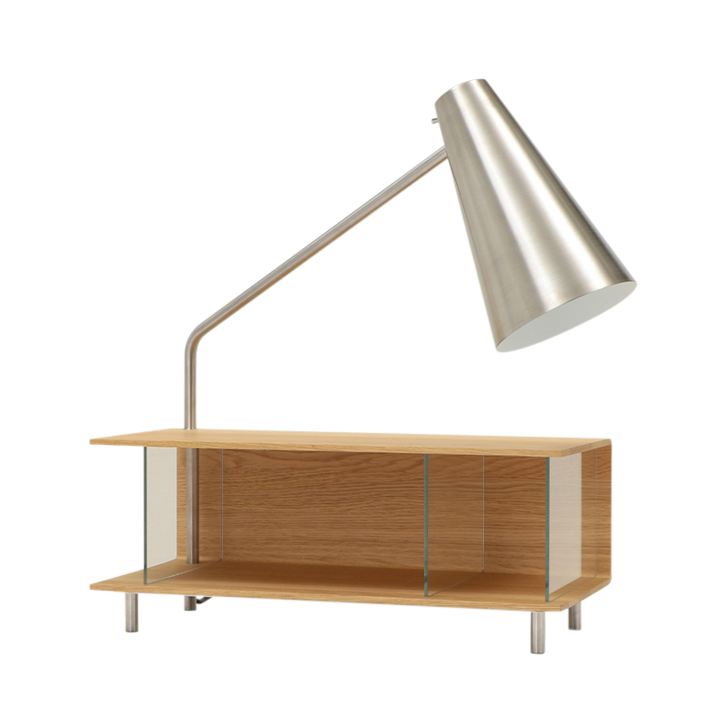 円錐形のランプの素材は、ヘアライン加工したスチール。ガラスと木製パネルをフィーチャーした棚と共に、優美にデスクのデザインに溶け込みます。