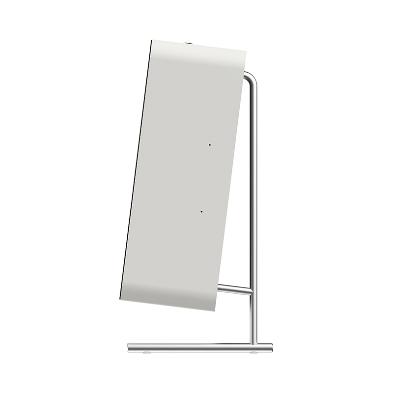 LE01スピーカー、1.5m AC電源アダプター、ステンレススチール製ナチュラル仕上げテーブルトップスタンド、シリコンドット、クイックスタートガイド、セーフティシート