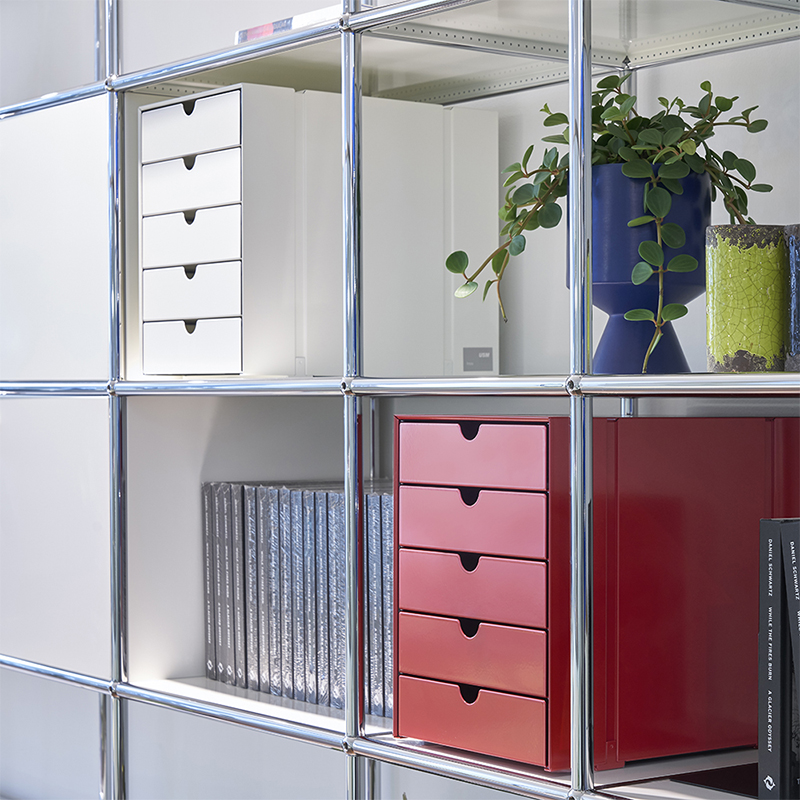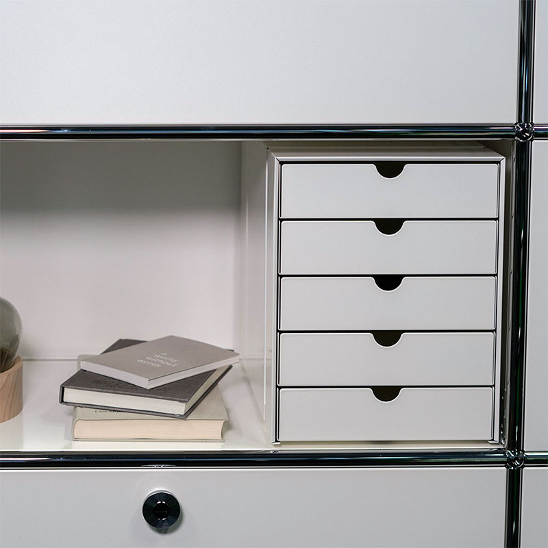 発売以来人気を集める USMイノス ボックスセットC4。5つの引き出しに細かいものからクリアファイルなどA4サイズのものまでしまえるボックスセット。