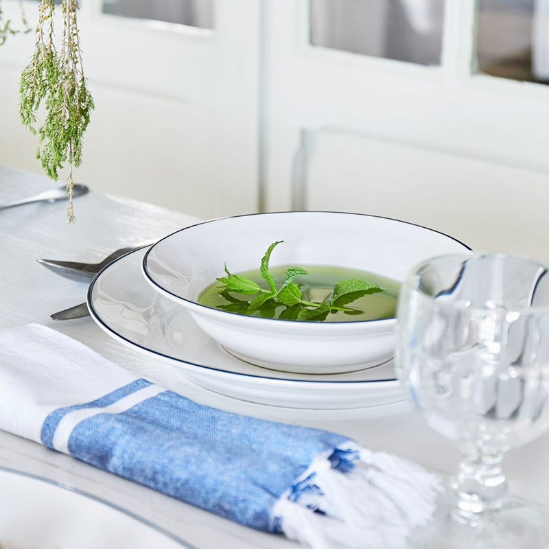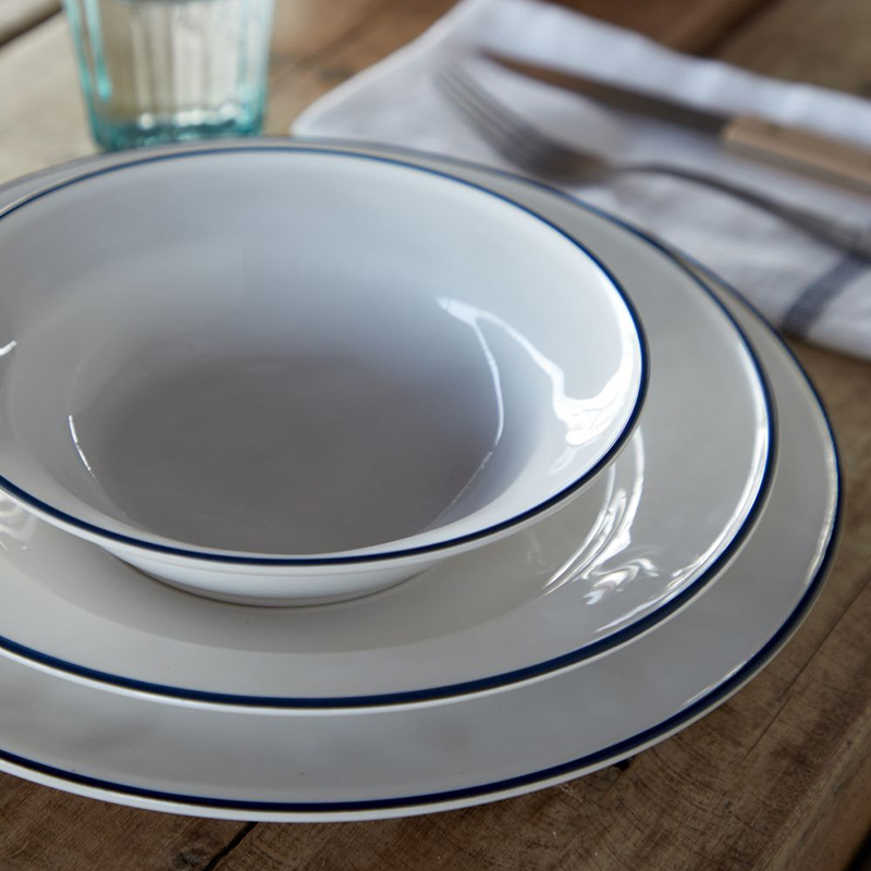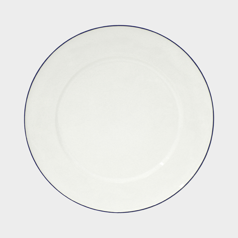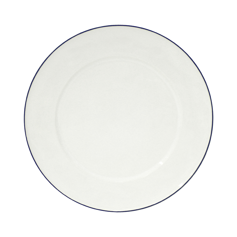 アイボリーがかった白地に、ややくすみのあるネイビーのラインを縁にあしらった、すっきりとしたデザインと色合いが魅力のチャージャープレートです。