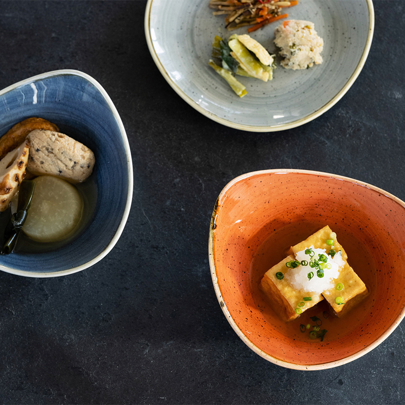 世界に二つと同じものがない温かみを感じられる、特別なうつわとして多くの人に愛されています。少しいびつな三角形の形は、料理を盛り付けるとバランスよく見え、ほどよくスタイリッシュに仕上がります。