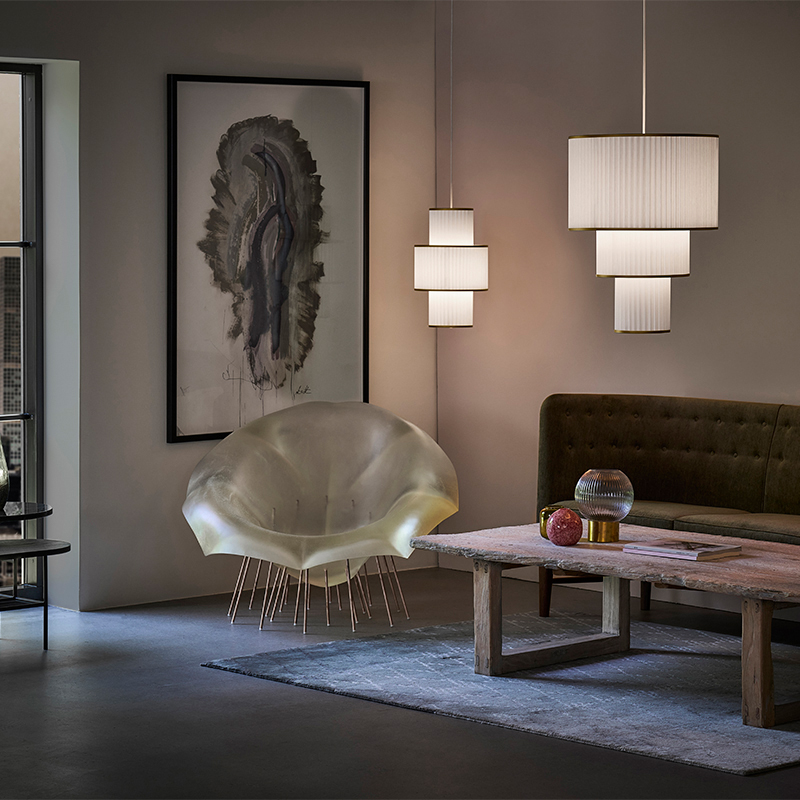 手仕事による伝統の折りはそのままに、新しく、美しいインスタレーションのような使い方もできる照明が完成しました。