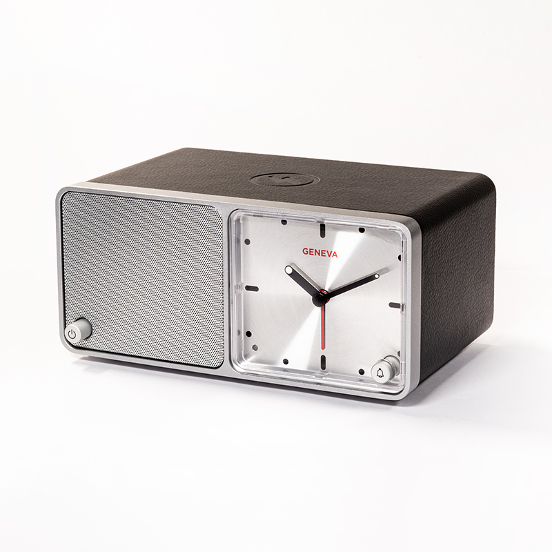 アナログクロックとスマートフォンのワイヤレスチャージ機能を装備したBluetoothスピーカー。