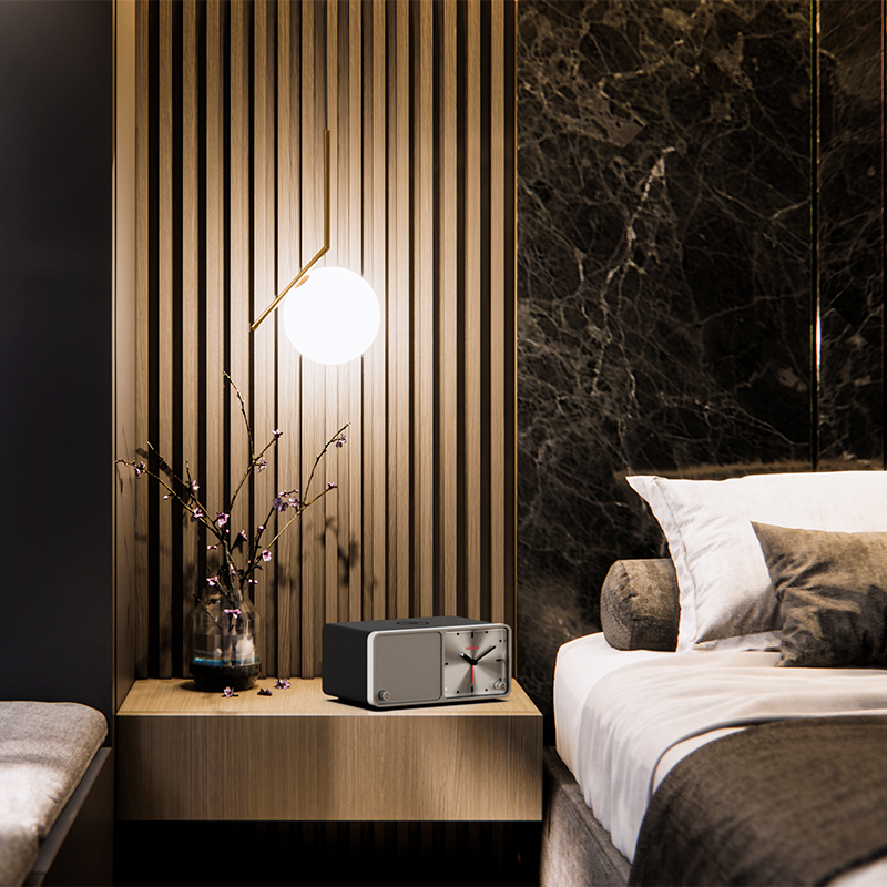 エコレザーに包まれたボディの中には、フルレンジスピーカーとパッシブラジエーターを内蔵。ベッドサイドやデスク等で時を刻むアナログクロックは、直感的に操作可能なアラーム機能を備える一方、お持ちのスマートフォンを載せるだけで充電が可能なワイヤレスチャージ機能が、現代の日常生活のニーズに応えます。さらに、背面にもUSB出力端子を備えているので、本機1台で最大2台のスマートフォンを充電できます。