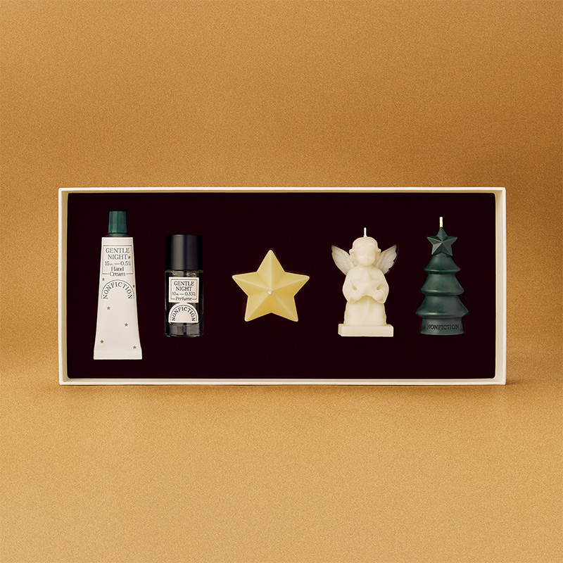 シーズン限定で登場したジェントルナイト ホリデーセットはノンフィクションのベストセラーであるジェントルナイトの香りのオードパルファム(10mL)とミニハンドクリーム(15mL)、そして3種類のオブジェキャンドルをセットにしました。