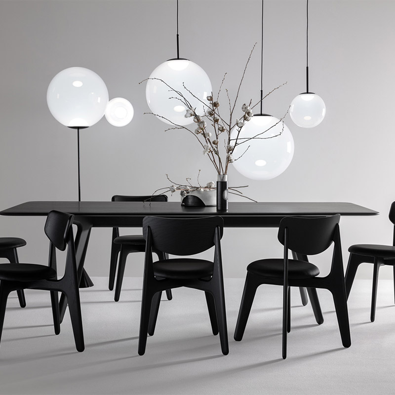 シェードの色が半透明であるがゆえに、昼間は実体のないゴーストのような儚さを保ち、夜になると見事なまでに明るく周囲を照らす球体へと変化します。トム・ディクソンが独自に開発した内蔵型LEDを使用することにより、柔らかく拡散する美しい光を実現しました。