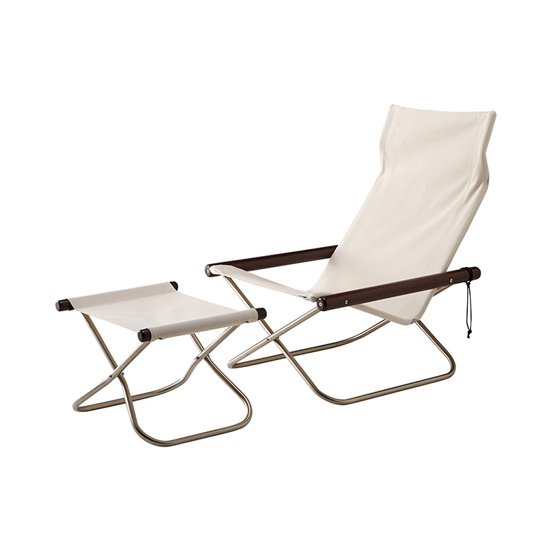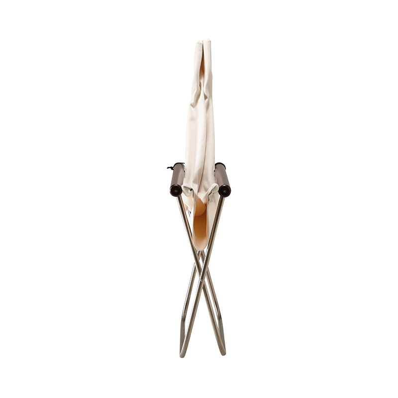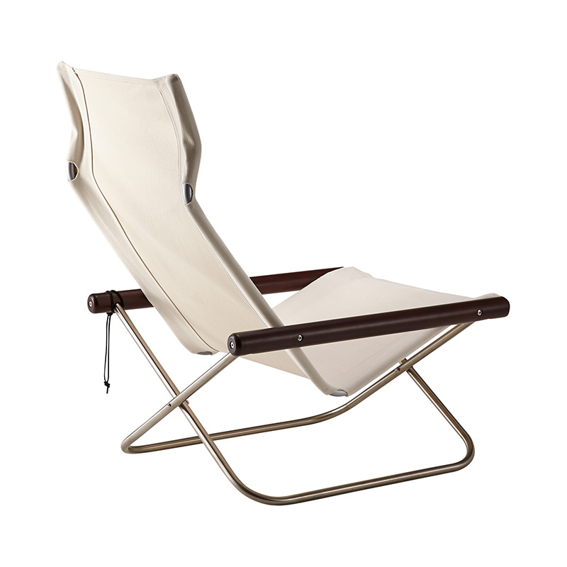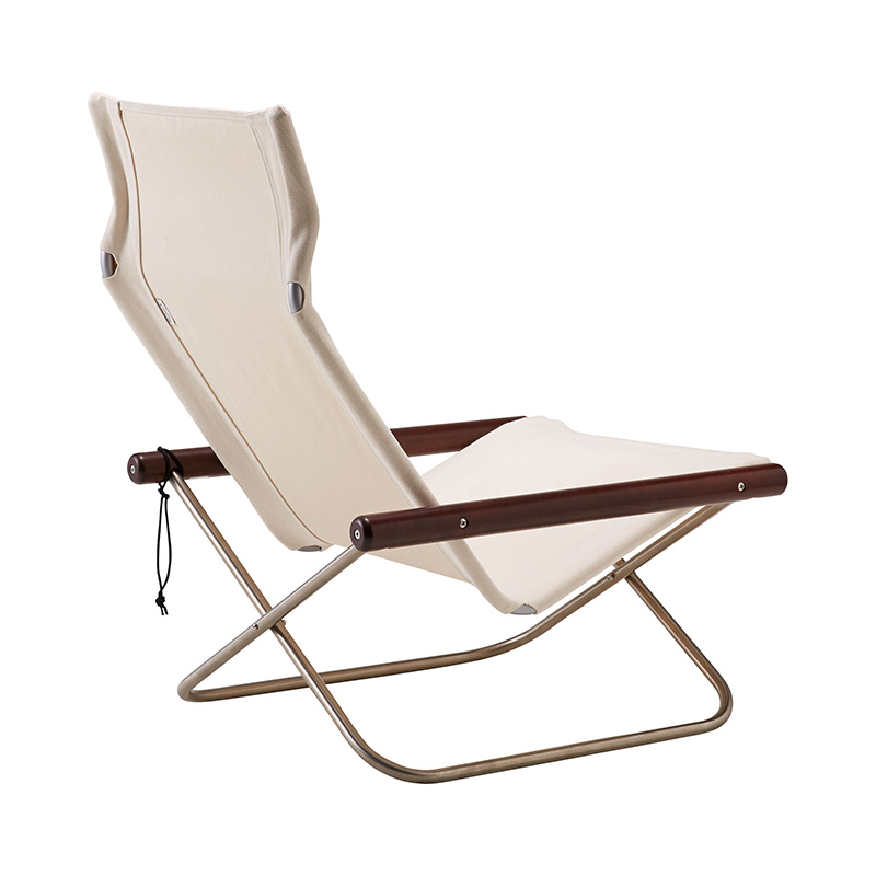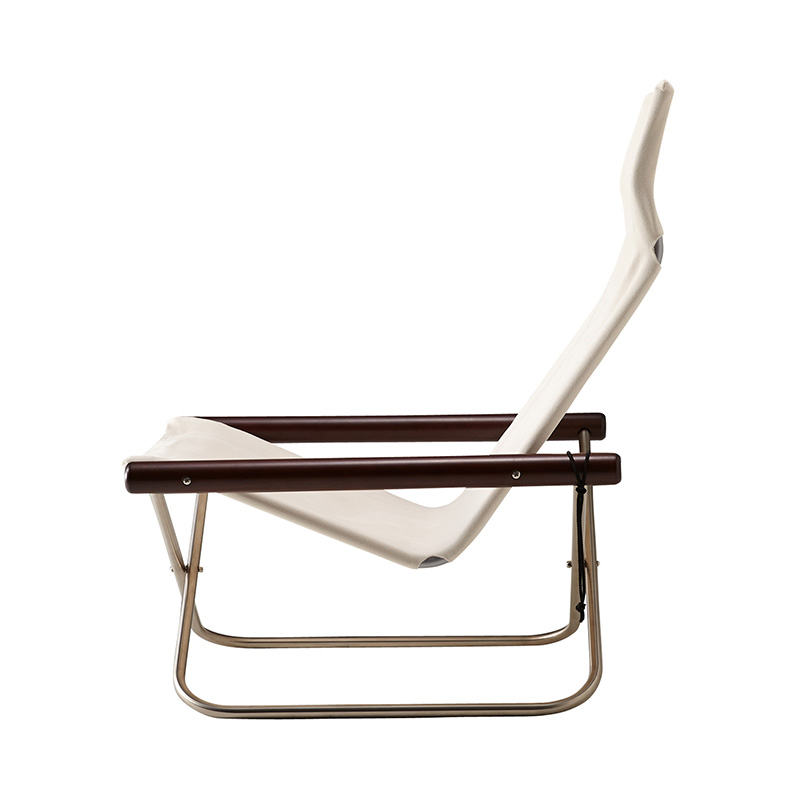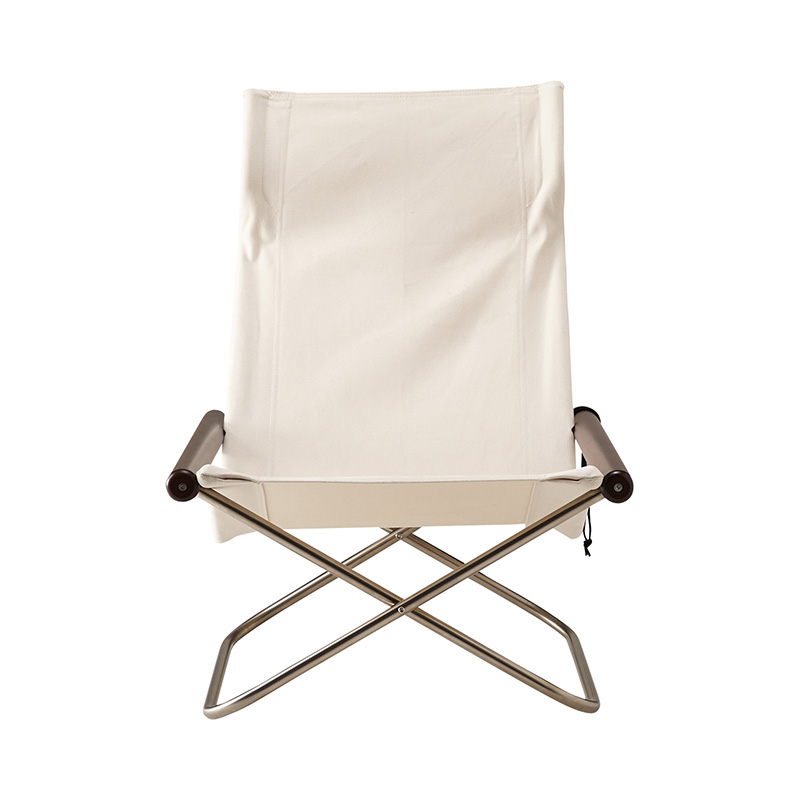 1970年、デザイナーの新居 猛(にい たけし)によって生み出された「ニーチェアエックス」。1950年代から折り畳み椅子づくりをはじめ、試行錯誤の末たどり着いたのが、脚部のX構造でした。さらに木製の肘かけ、シートには綿の厚織生地を採用。すべてが相まって、快適な座り心地を実現しています。その後に続く「ニーチェアエックスシリーズ」の原点であり、生涯折り畳み椅子の開発に取り組んだ新居の集大成といえる製品です。