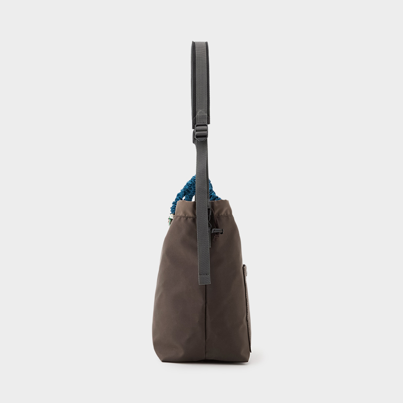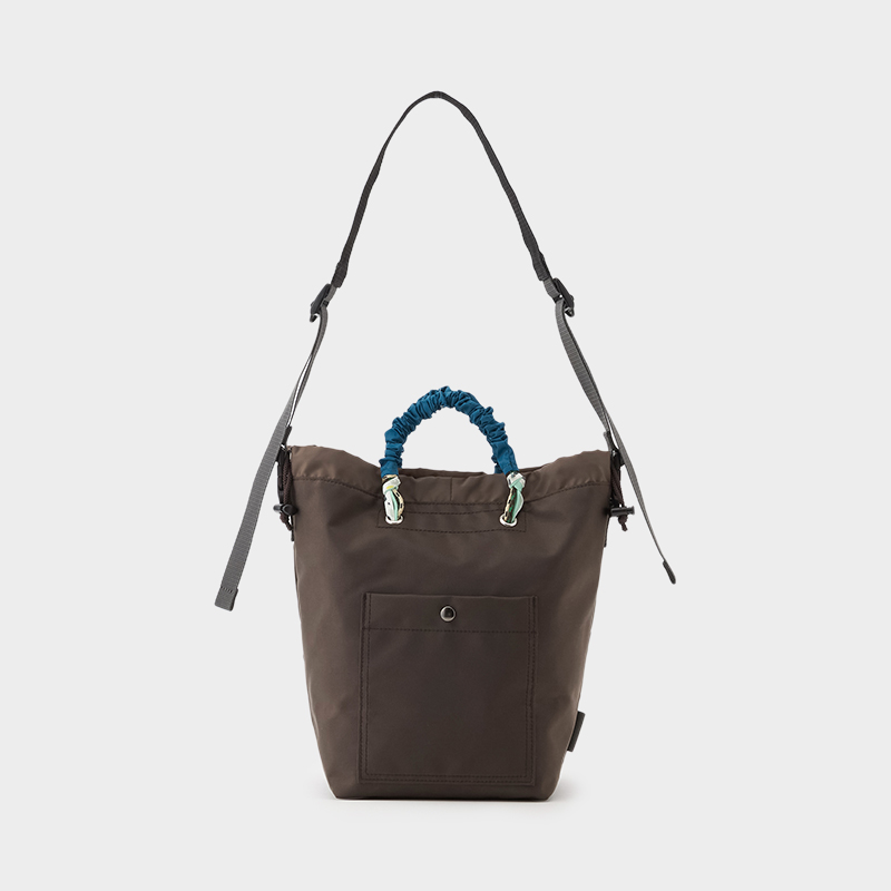 革以外の素材を指す“雑材” をメインにし、気軽さと実用性、ファッション性を備え持った大人のカジュアルスタンダードを追求するブランドです。軽量でハリのあるナイロンを使用し、コードとマイクロファイバースエードを束ねたハンドルと肩掛け用のテープショルダーが付いた2WAY筒形トートバッグ。