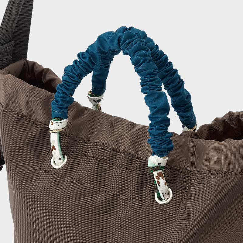 軽量でハリのあるナイロンを使用し、コードとマイクロファイバースエードを束ねたハンドルと肩掛け用のテープショルダーが付いた2WAY筒形トートバッグ。