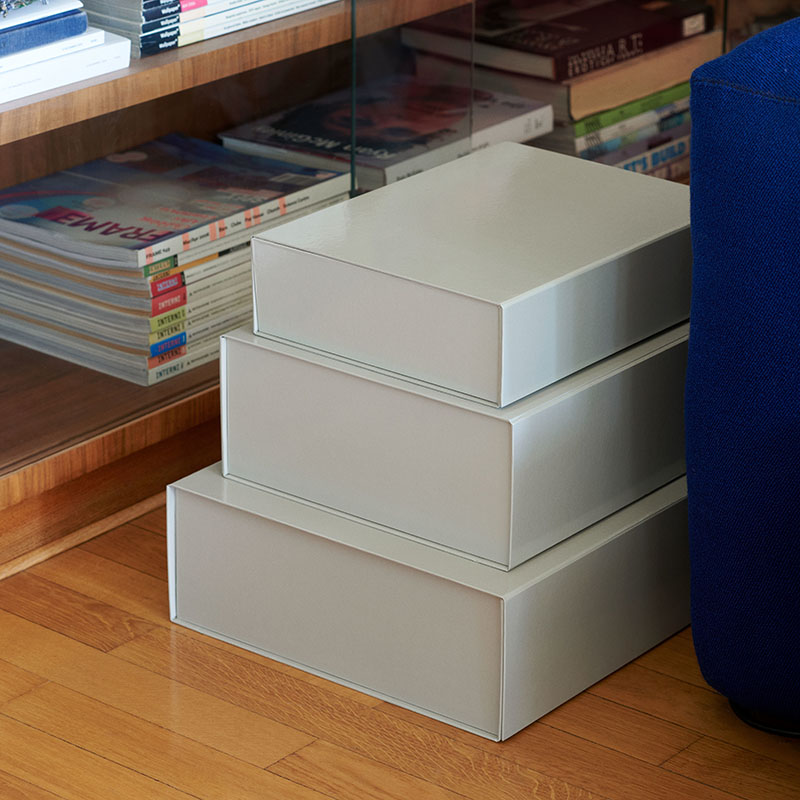 美しく光沢のある仕上がりの長方形のボックスは、FSC認証を受けた丈夫な極厚の厚紙で作られており、デスクや棚、食器棚など、さまざまなアイテムの整理や収納で活躍します。