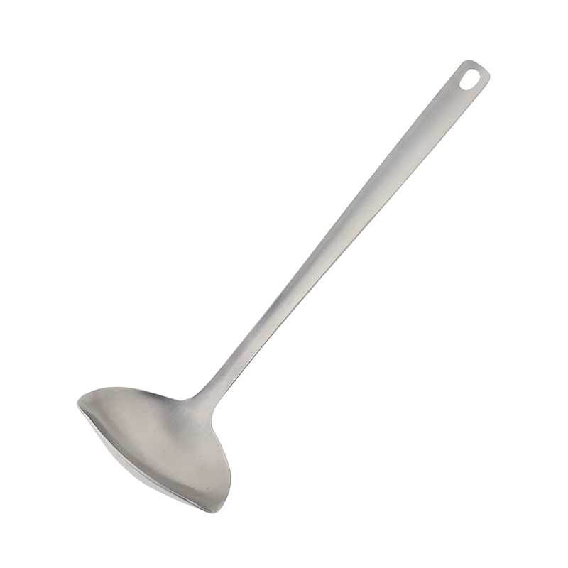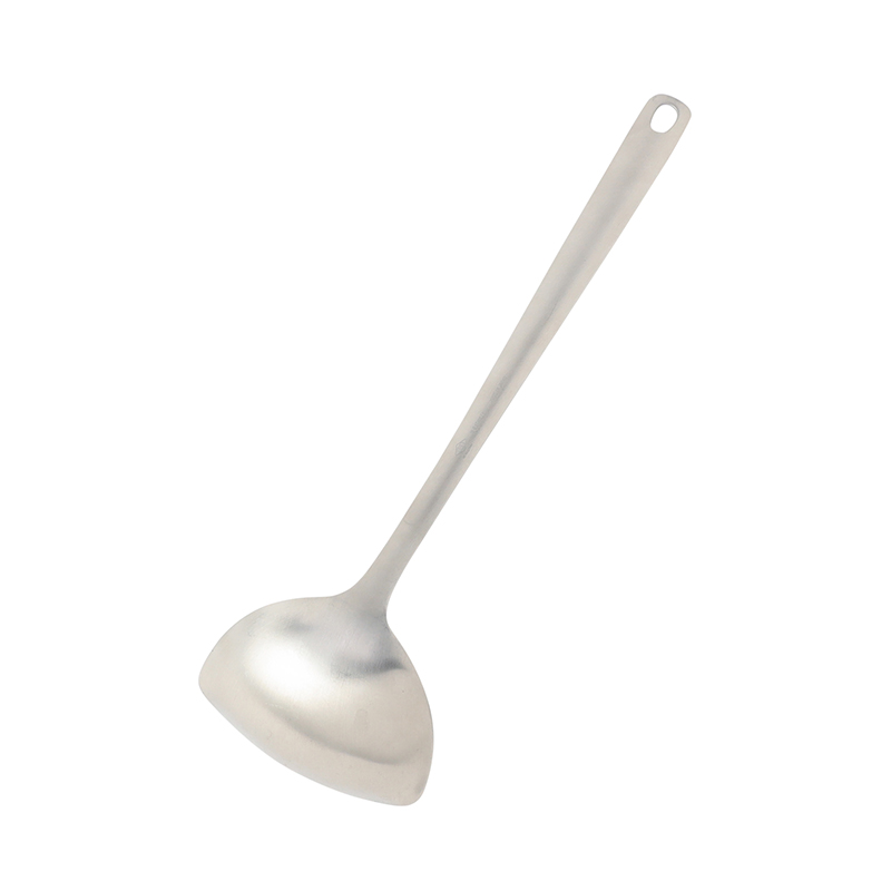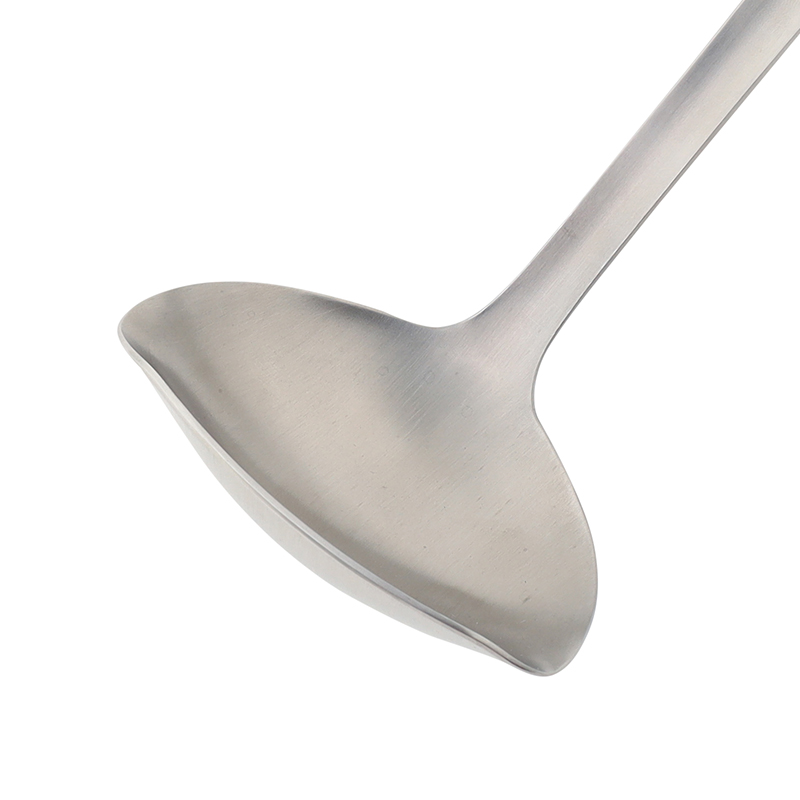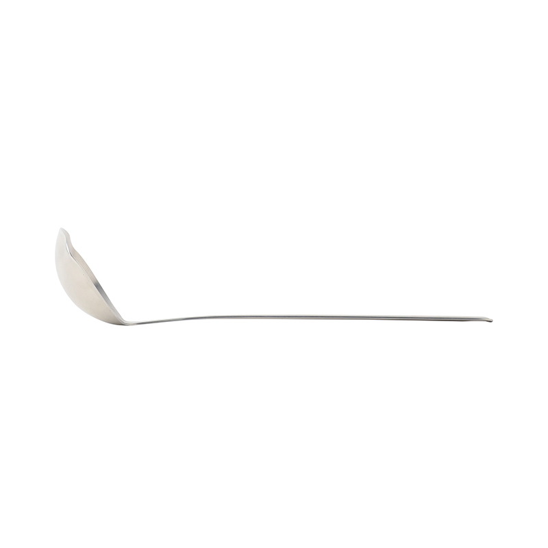 手前面は鍋底に、尖った注ぎ口は届きにくい鍋の角にフィットして「すくいやすく」、なだらかな曲面はつたってこぼれ落ちにくく「注ぎやすい」、対称形状で利き手に関係なく使えるシンプルなレードルです。