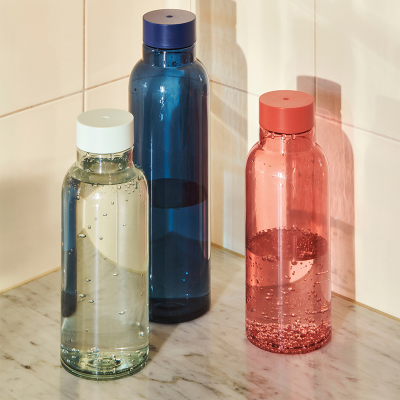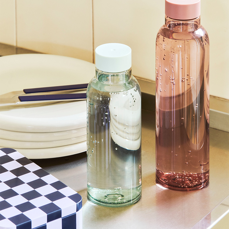 スリムな形状とすっきりとしたラインがこのボトルは、リサイクルPET製で、シリコンリングは取り外し可能なため簡単に洗うことができます。