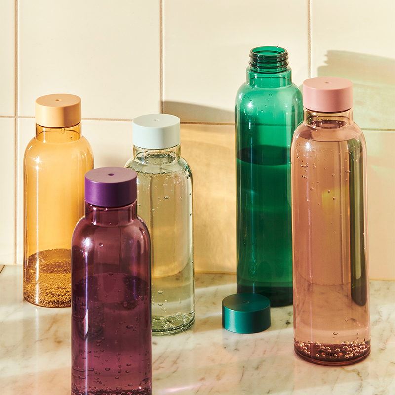 スリムな形状とすっきりとしたラインがこのボトルは、リサイクルPET製で、シリコンリングは取り外し可能なため簡単に洗うことができます。