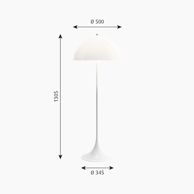 アクリル製の半球形シェードが柔かい拡散光を周囲の空間にひろげます。シェード先端とその内部のトランペット形ソケットカバー先端を結ぶ延長線上に電球のフィラメント部分がくるようデザインされており、パントンと個人的にも親しかったポール・ヘニングセンのランプデザインの影響がうかがえます。