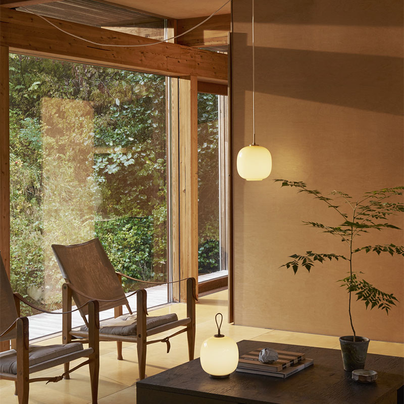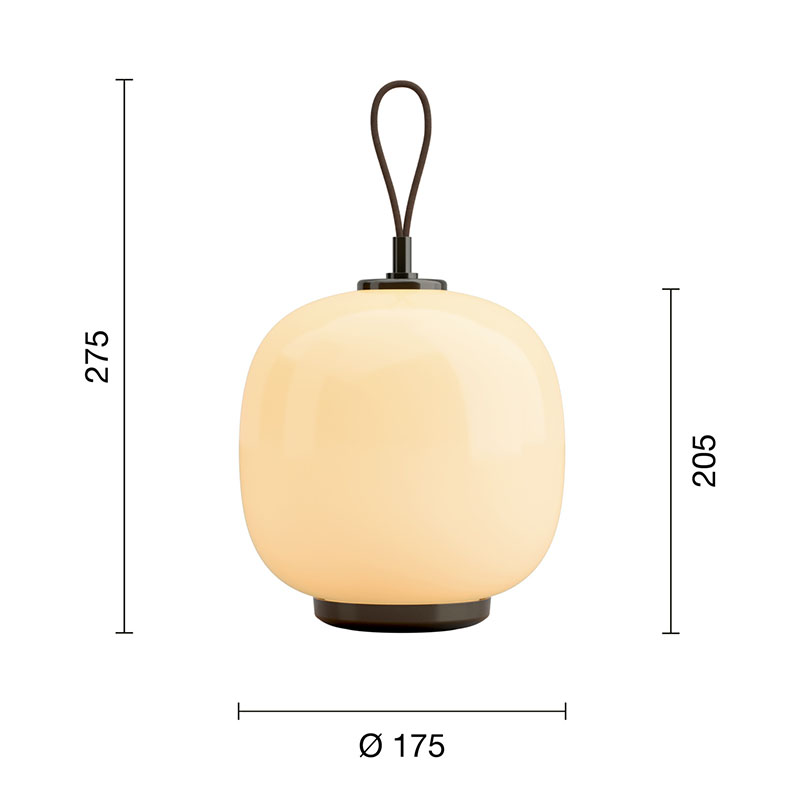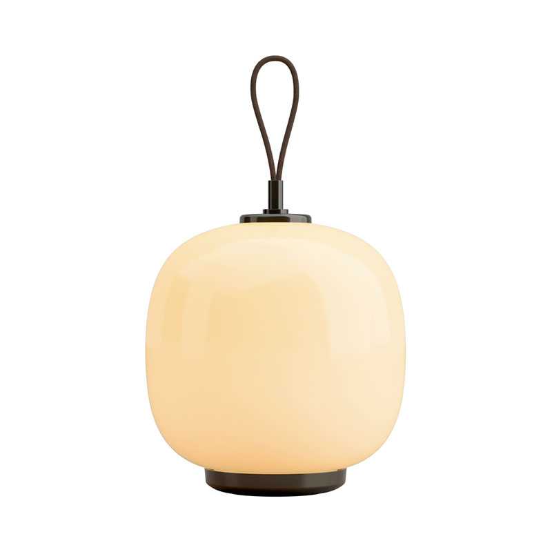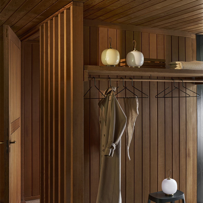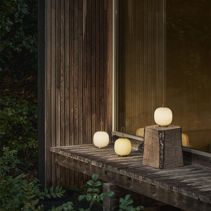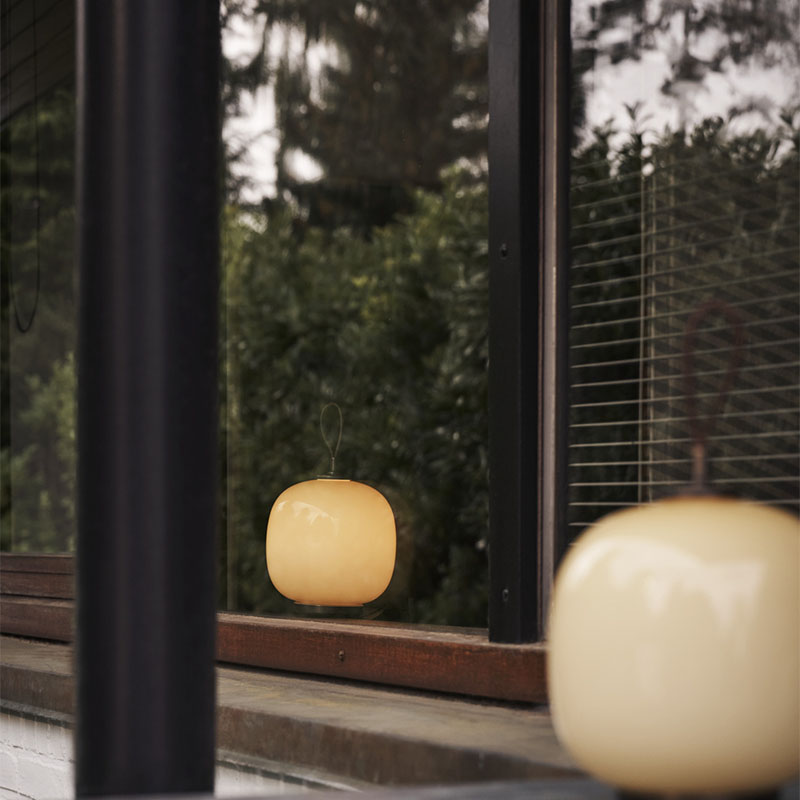 VL 45 ラジオハウス ペンダントをベースにした「VL 45 ラジオハウス ポータブルランプ」は、屋内外問わずどこでも持ち運びができ、クラシックなハンドメイドのオパールガラスが光と雰囲気を演出します。