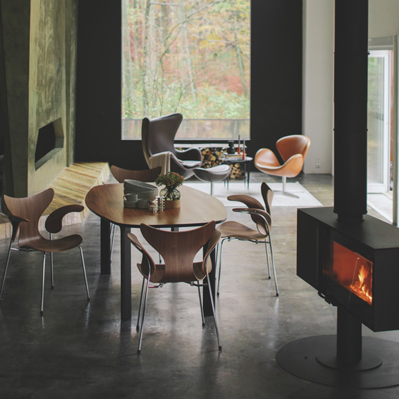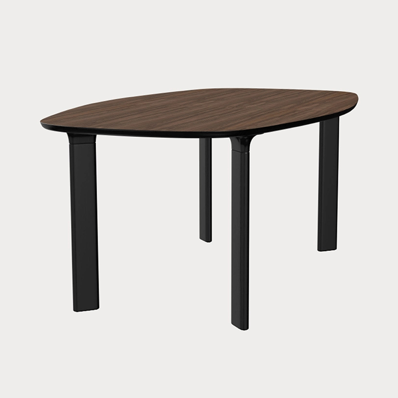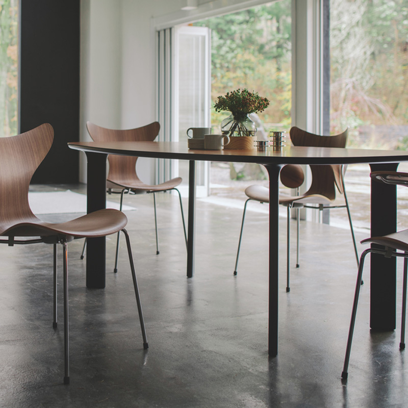 テーブルは複数の機能を同時に満たすべきだというアイディアから、家族が集まり、食事をし、本を読み、仕事 をする、そして座る人みんなの顔が見える特徴的なフォルムの天板を実現しています。