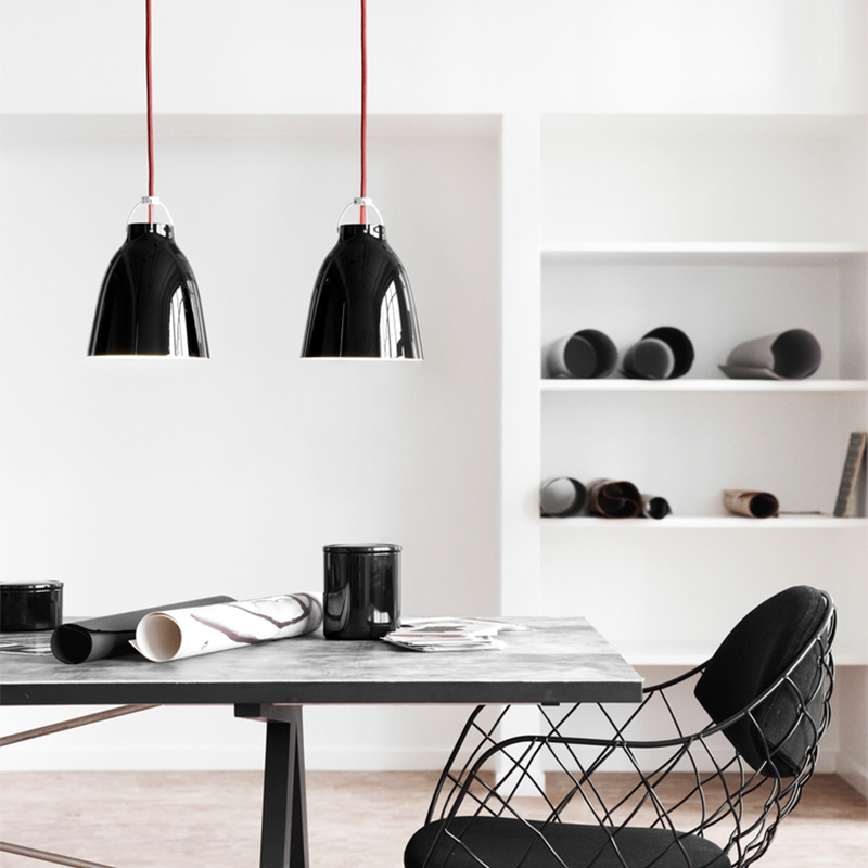 シンプルでタイムレスなペンダントは、ソフトでフェミニンな輪郭のスチール製シェードと、クロームメッキ仕上げのアルミニウム製のアームで構成されています。テキスタイルのケーブルは、デザイン中で重要な要素となっています。