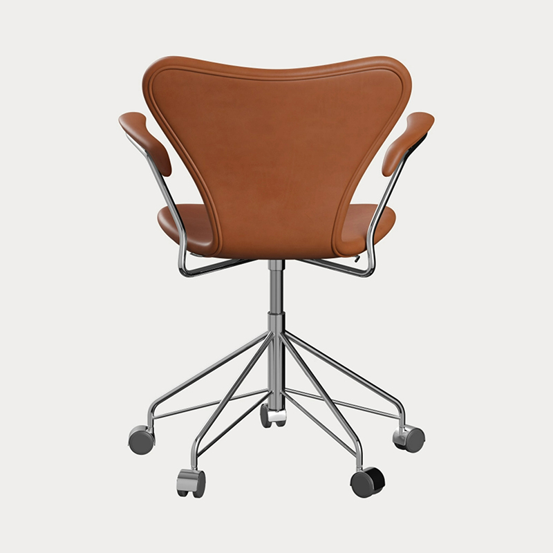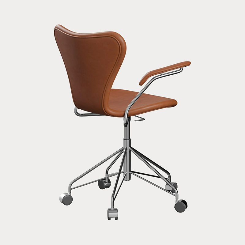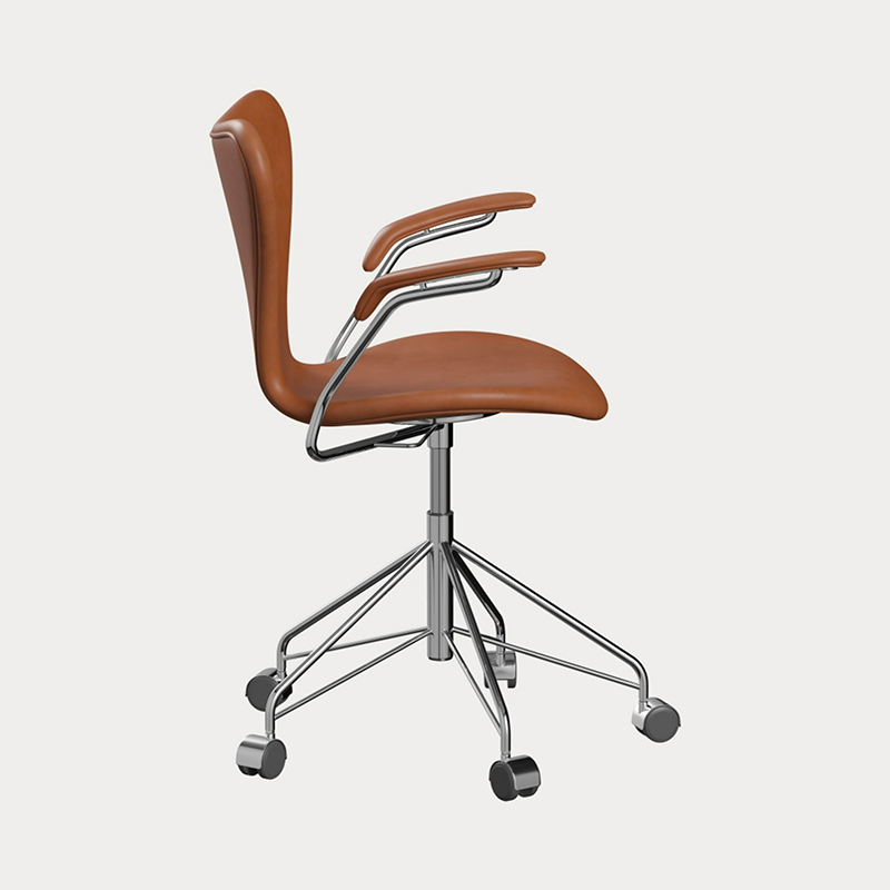 アームレスト付きのオリジナルデザインに、高さ調整機能と回転機能を備えたベースと丈夫なダブルキャスターを融合させたアームチェア仕様の3217モデルのセブンチェア。