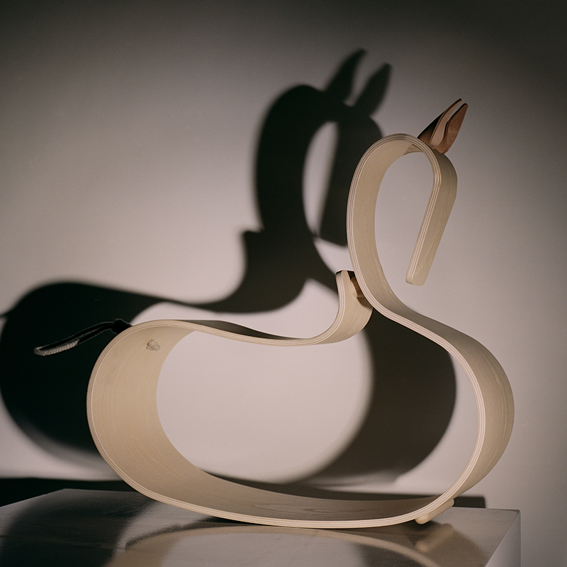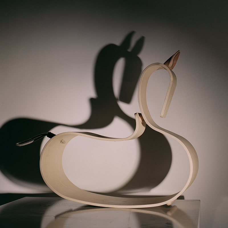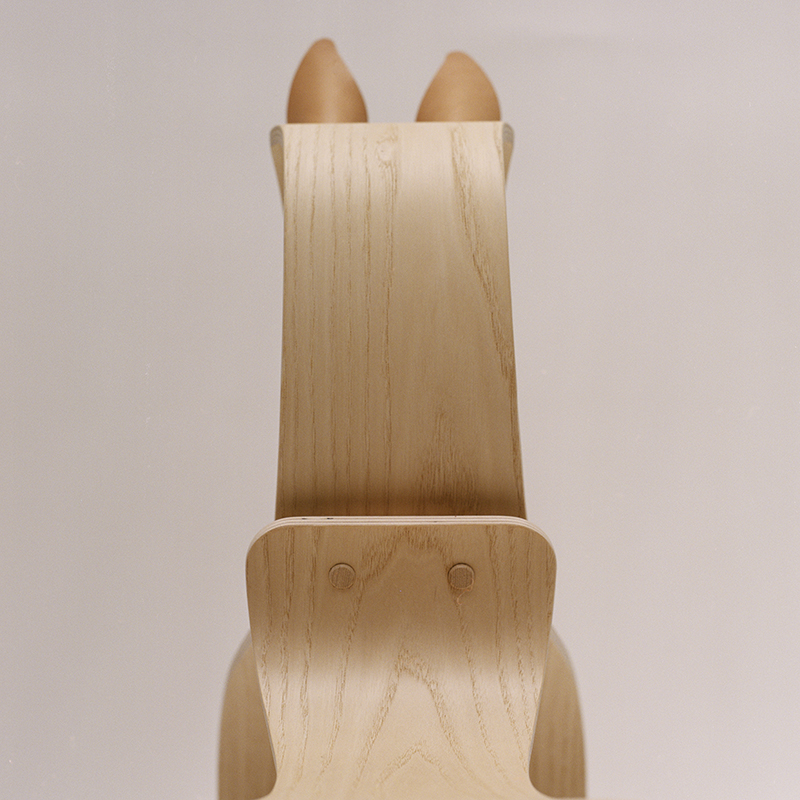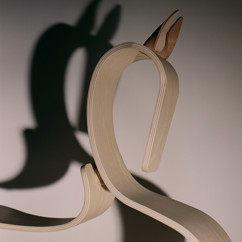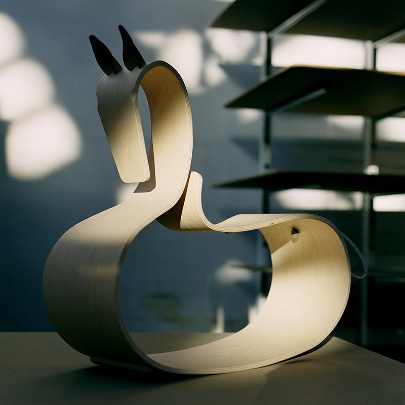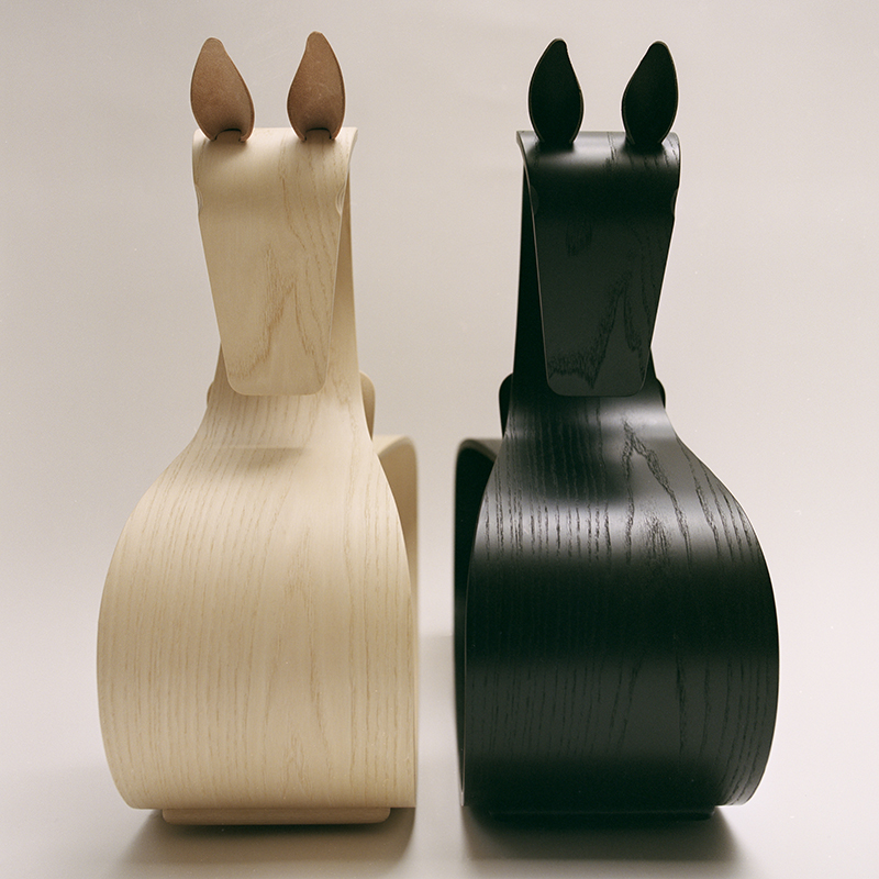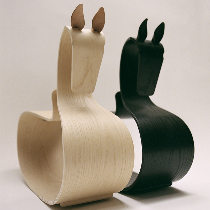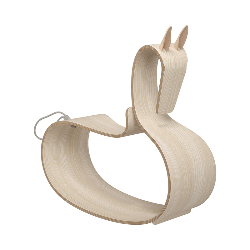 コンテンポラリーな美しさが光るこのロッキングホースは、1枚の成形合板から作られています。この成形合板は、後にアルネ・ヤコブセンがスタッキングチェアに使った素材でもあります。