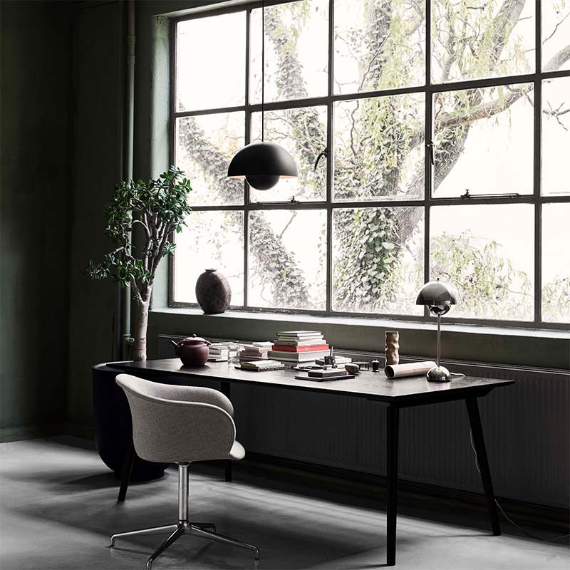 ミッドセンチュリーの代表的なデザイナーVerner Panton(バーナー・パントン)が1968年にデザインした「フラワーポット」シリーズ。60年代の平和運動”フラワーパワー”の象徴的な存在ともなった照明です。二つの半球を組み合わせ、球体内で光が反射し外に柔らかい光が広がる構造のフラワーポットは、現在でもモダンデザインの代名詞ともなっています。VP7は、3種類あるペンダントシリーズの中で中間サイズの直径370mmの大きさで、一灯吊りでも十分なサイズ感です。
