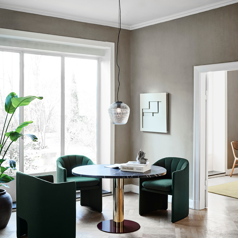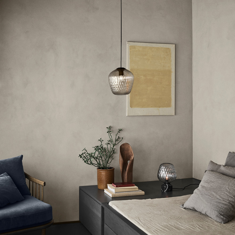 イギリスのデザイナーのSamuel Wilkinsonによりデザインされた「ブラウン」ライトシリーズ。光の反射と屈折を照明のデザインに活かすことができないかと実験していた中、一定のパターンで刻まれたガラスで光源を覆うことで、美しいキルティングのような陰影を作り出すことができると発見し、この照明デザインに繋がりました。天井やテーブル双方向に広がる光の陰影の美しさがなにより魅力的な照明です。