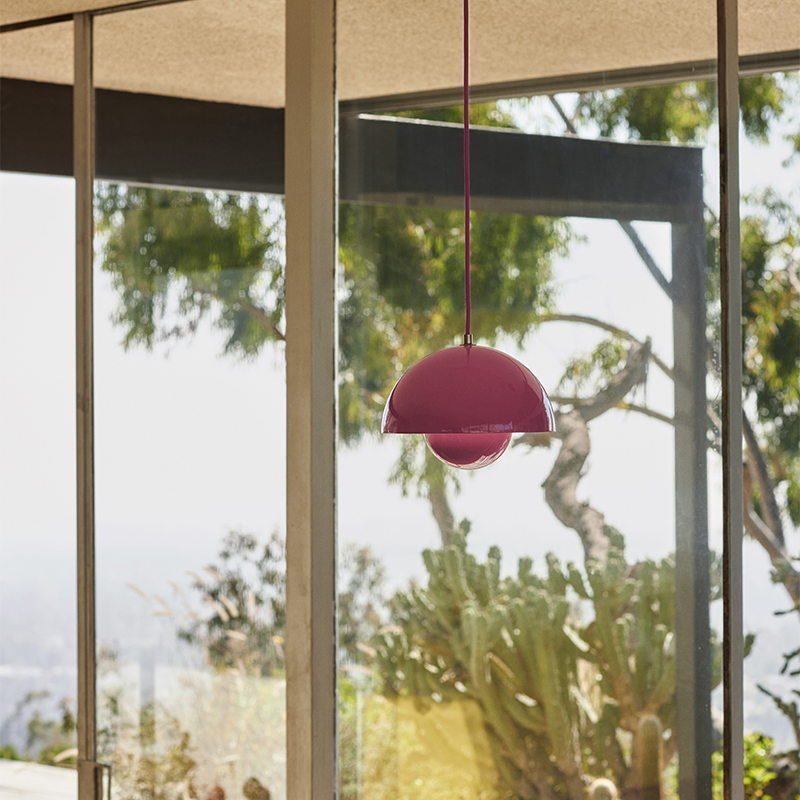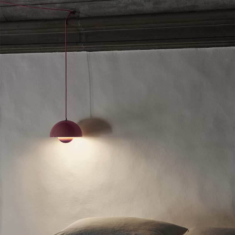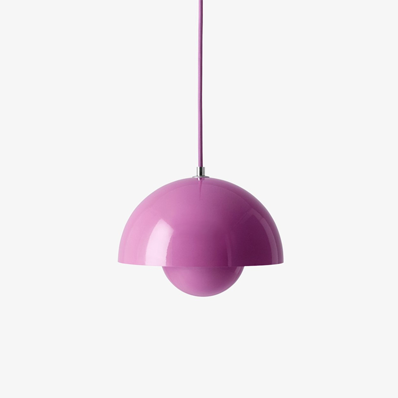 フラワーポットシリーズは、3種類のペンダントと2種類のテーブルランプで構成されており、幅広いカラーからお選びいただけます。2つの重なり合うシェードは金属を成形したものが組み合わされています。