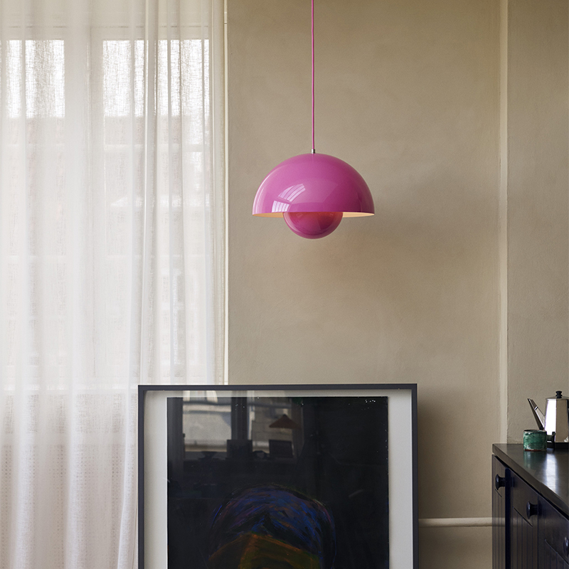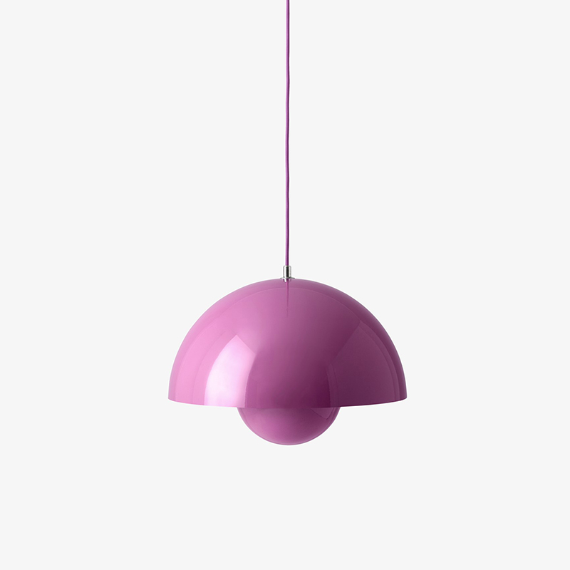 フラワーポットシリーズは、3種類のペンダントと2種類のテーブルランプで構成されており、幅広いカラーからお選びいただけます。2つの重なり合うシェードは金属を成形したものが組み合わされています。